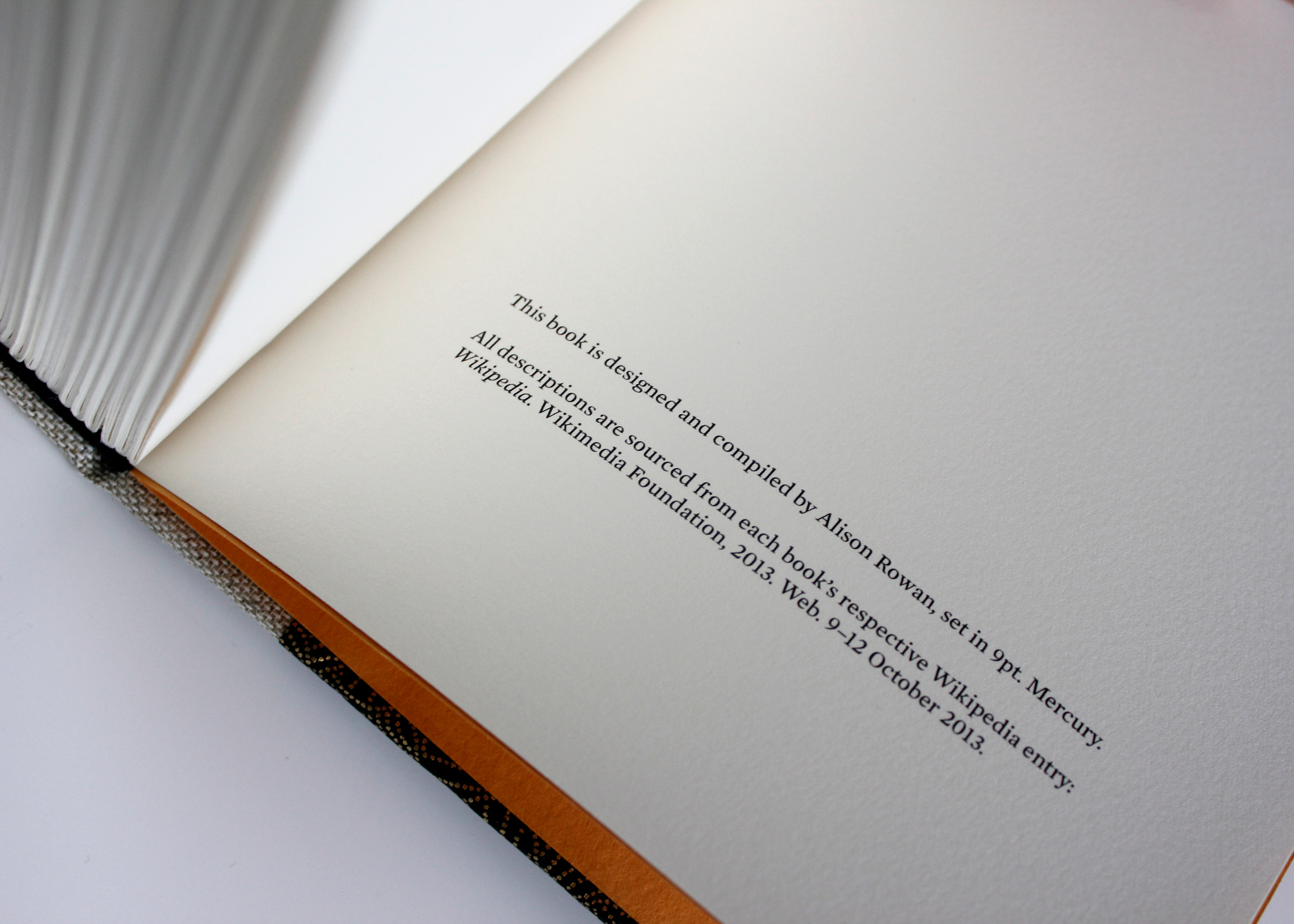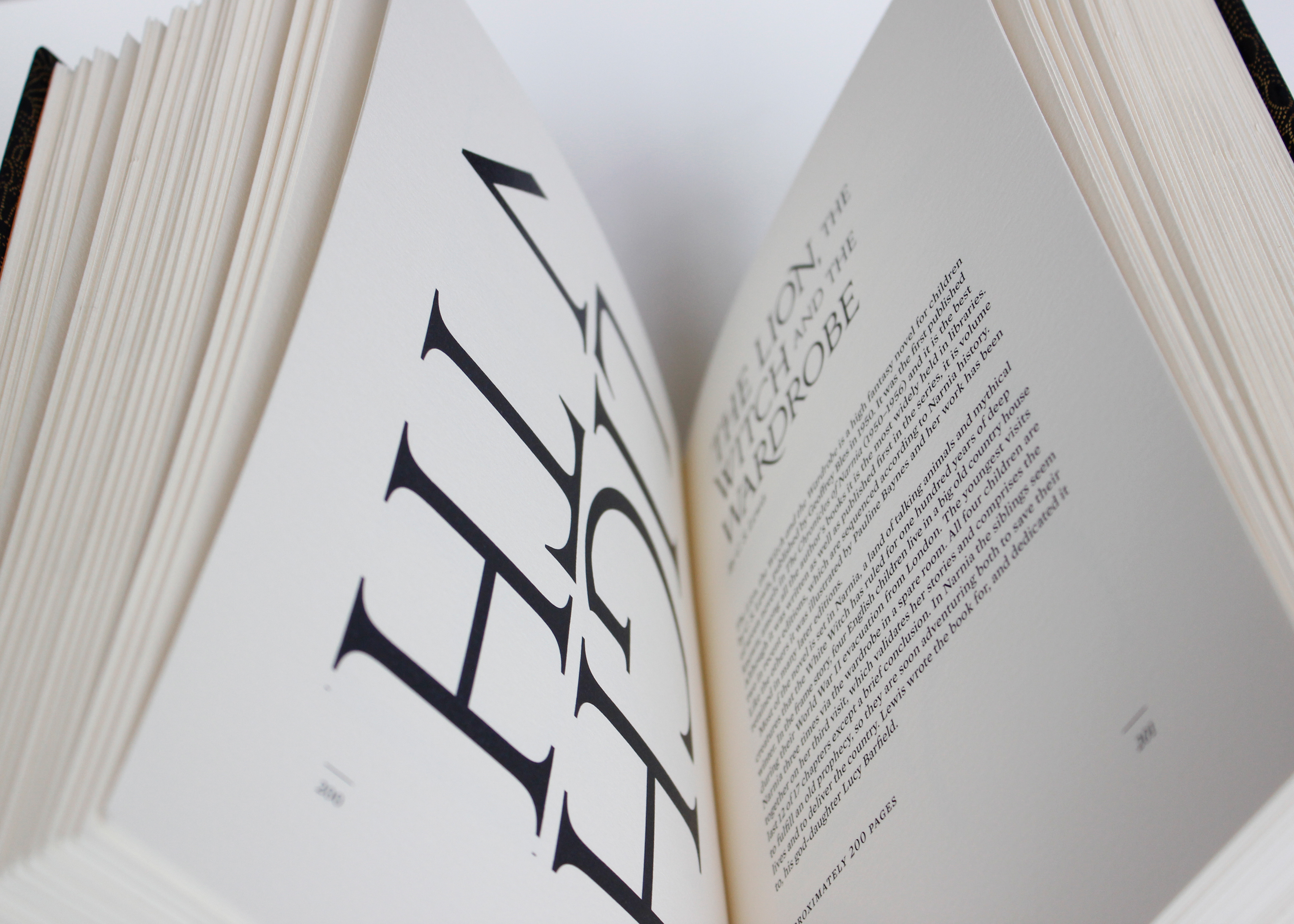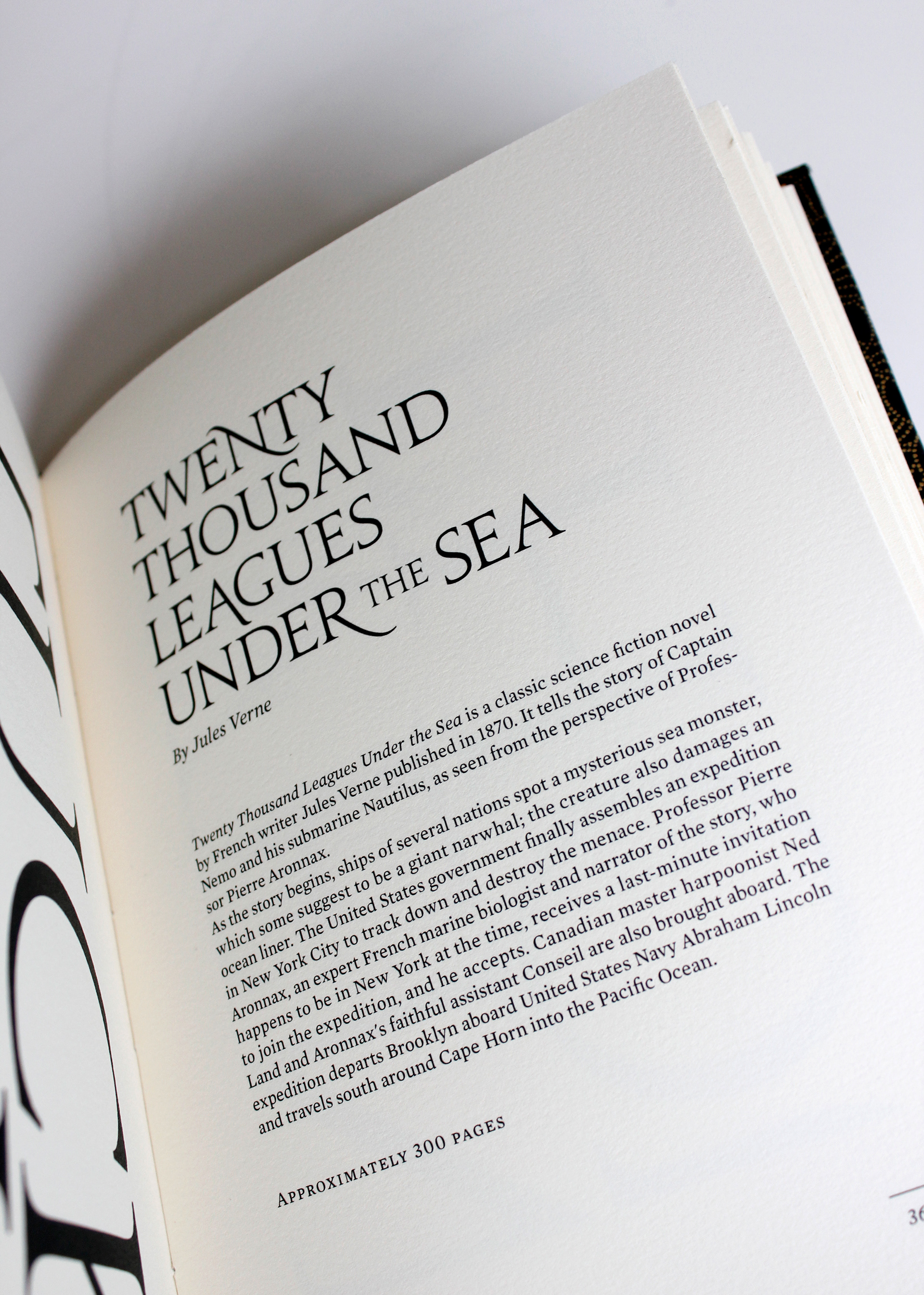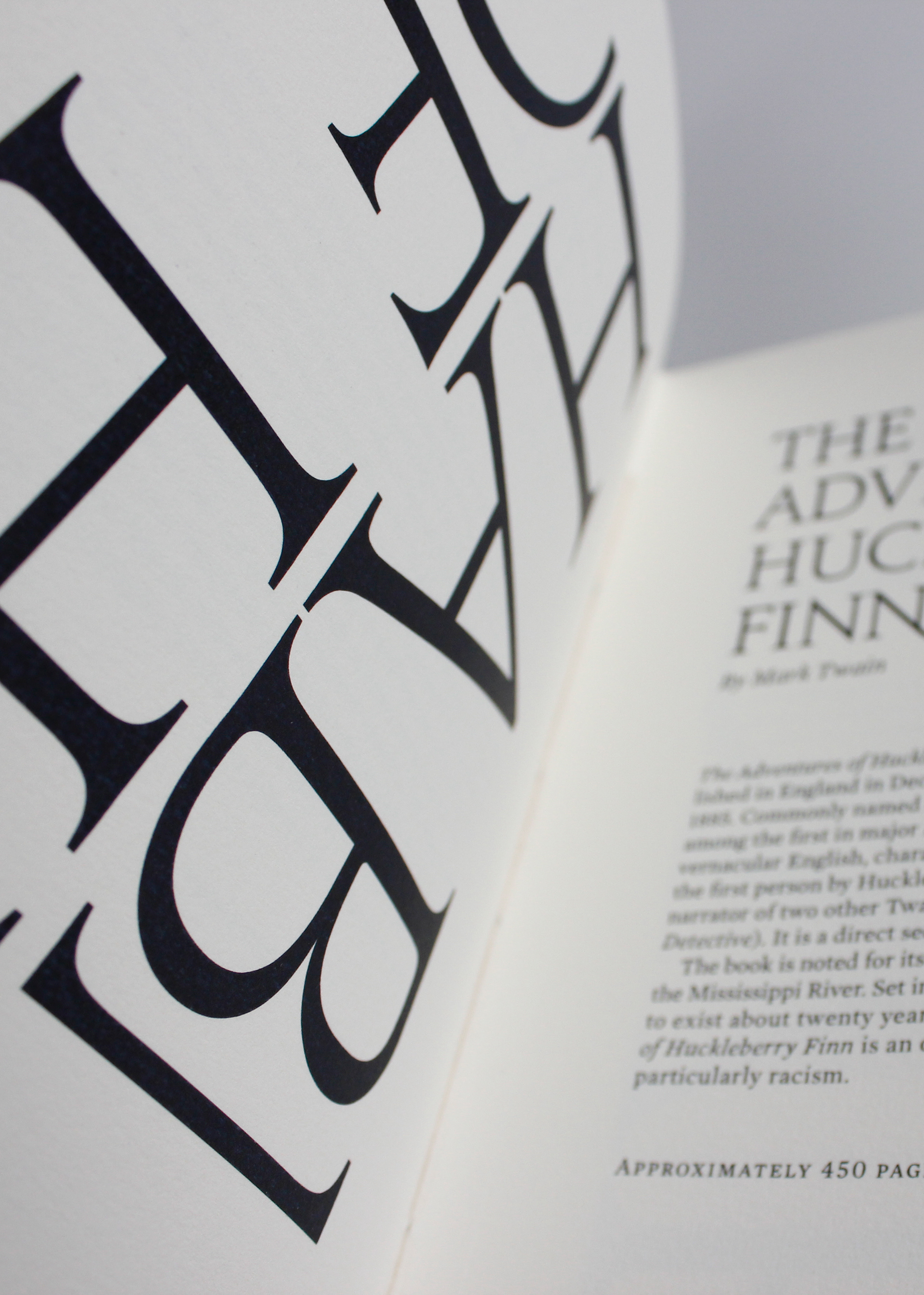 Each book featured fills both sides of a page, the front featuring its title, author, a brief description, and its page count, while the back transforms its title into typographic art, carefully cropped to abstract the title in an interesting way.