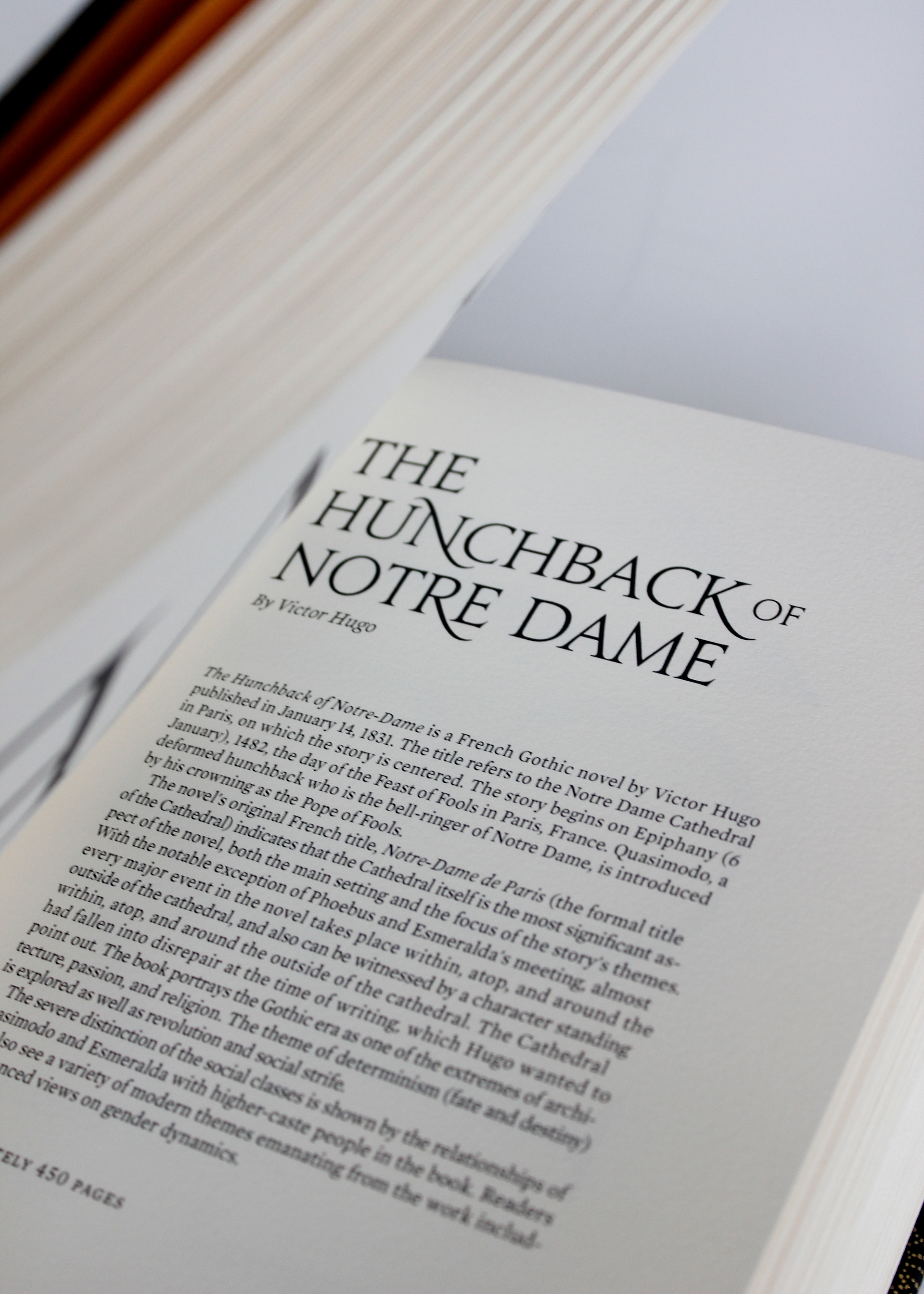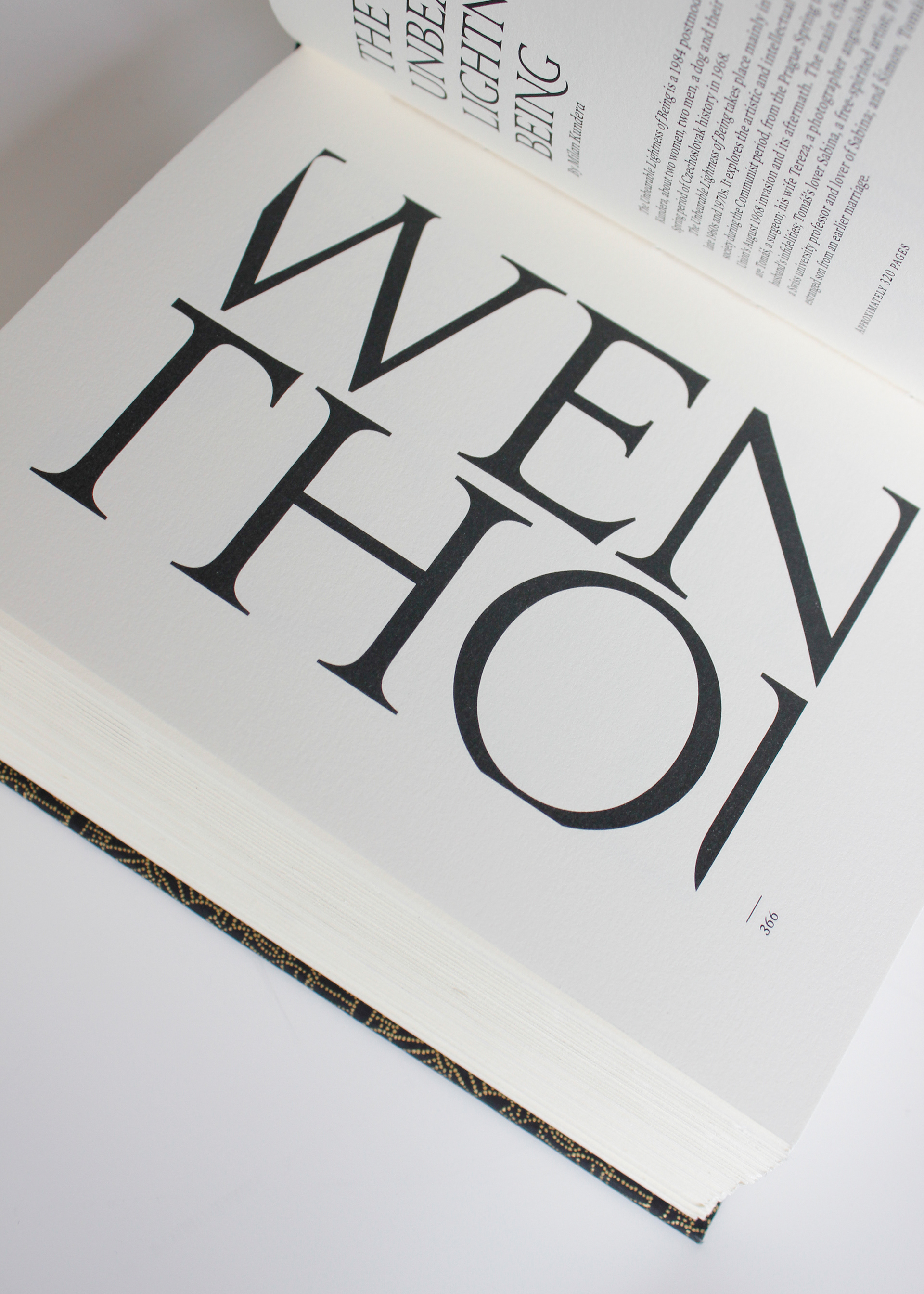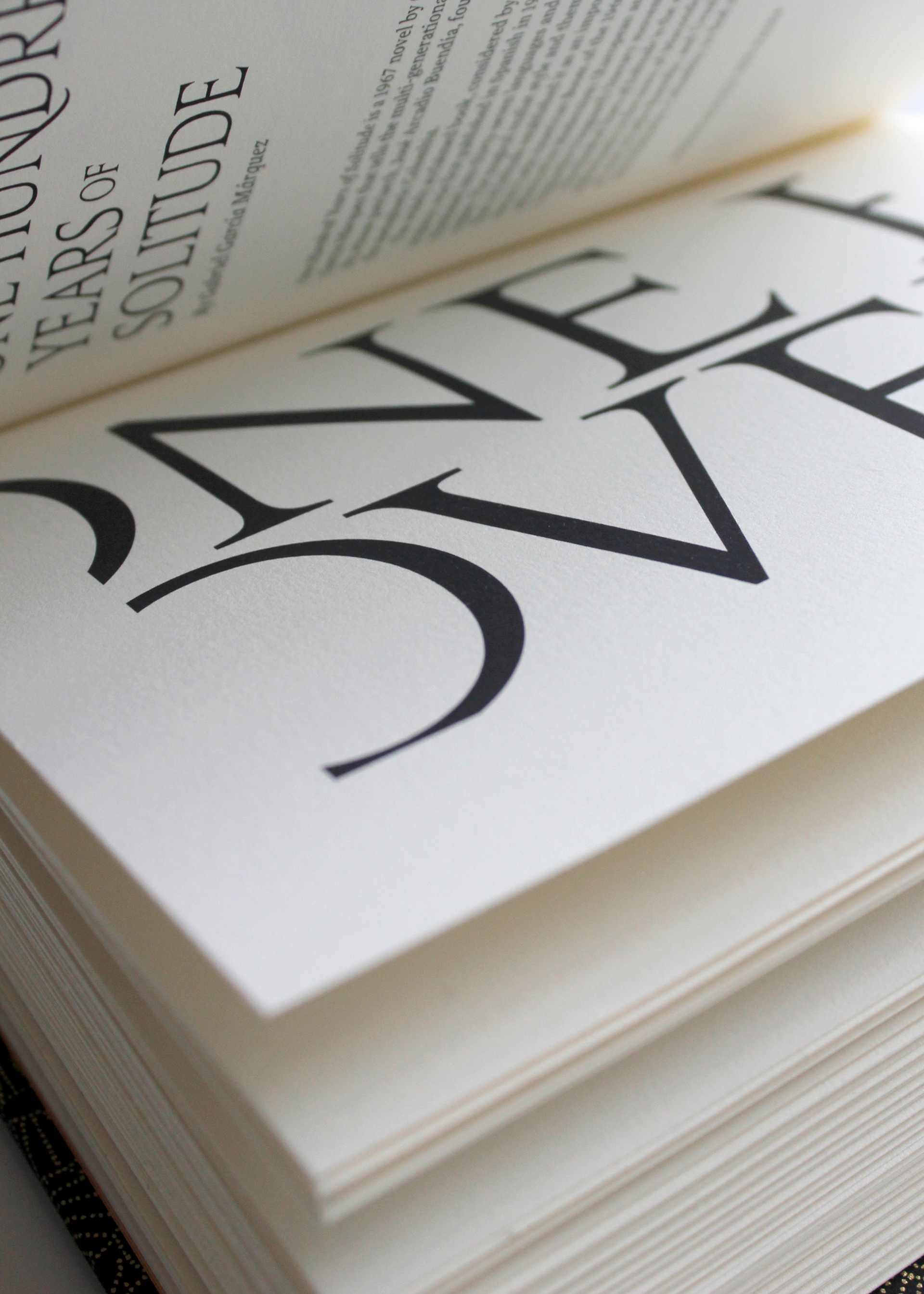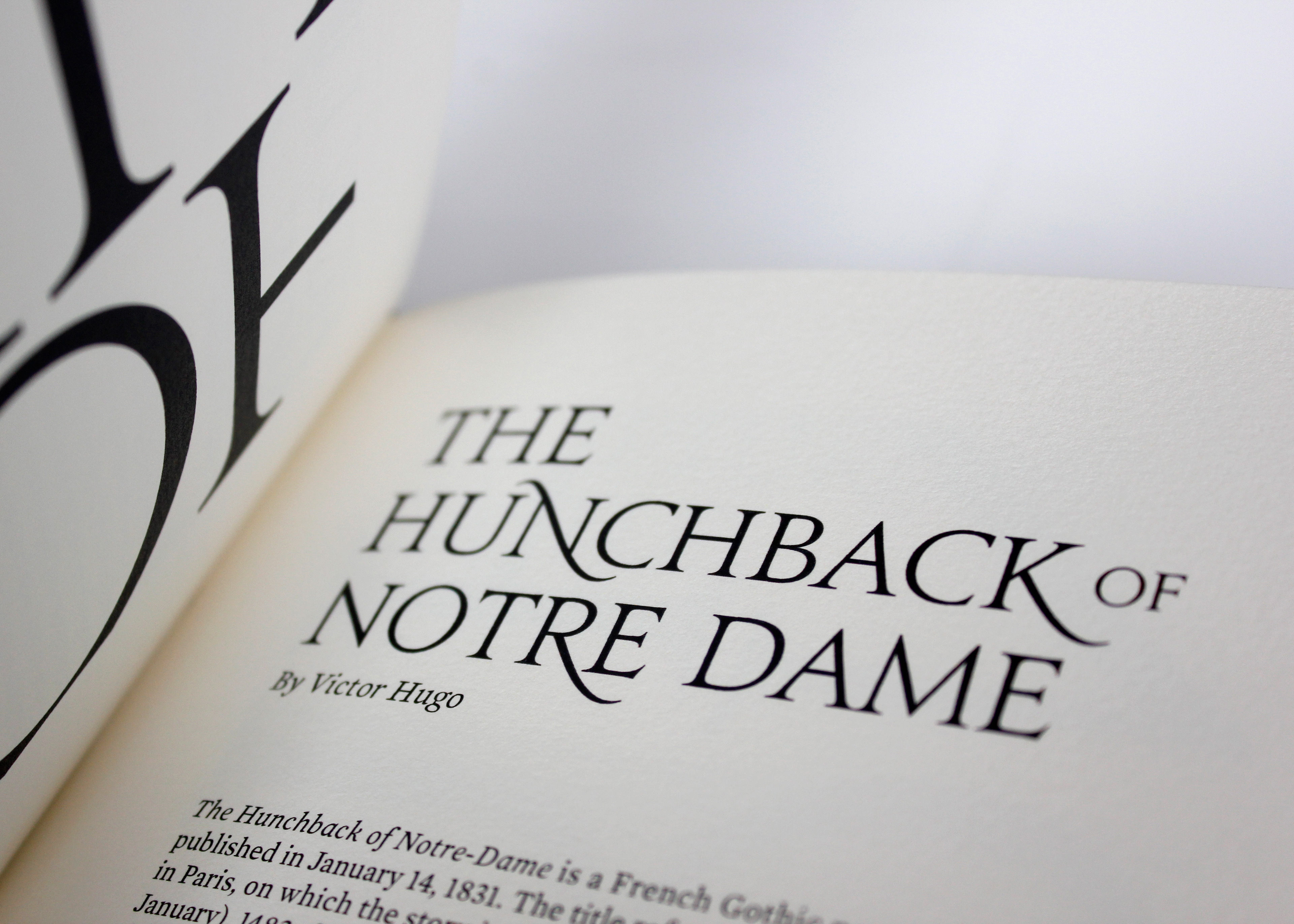 Each book featured fills both sides of a page, the front featuring its title, author, a brief description, and its page count, while the back transforms its title into typographic art, carefully cropped to abstract the title in an interesting way.