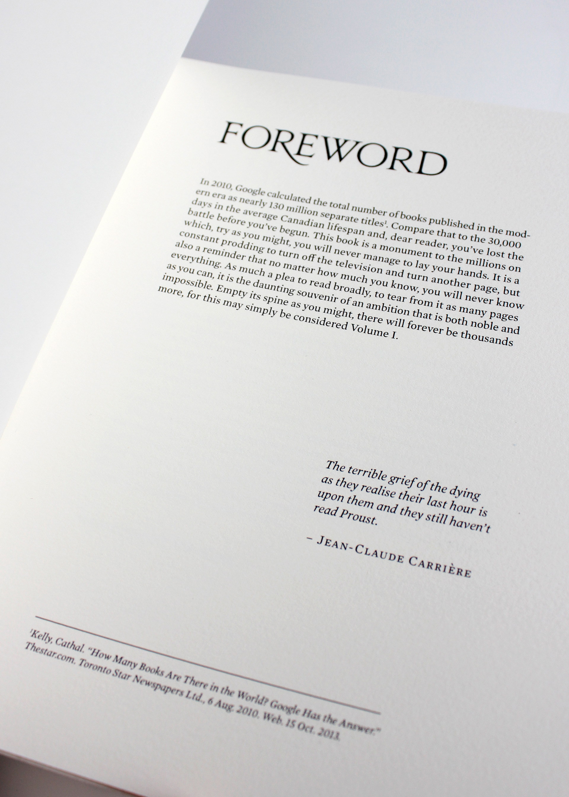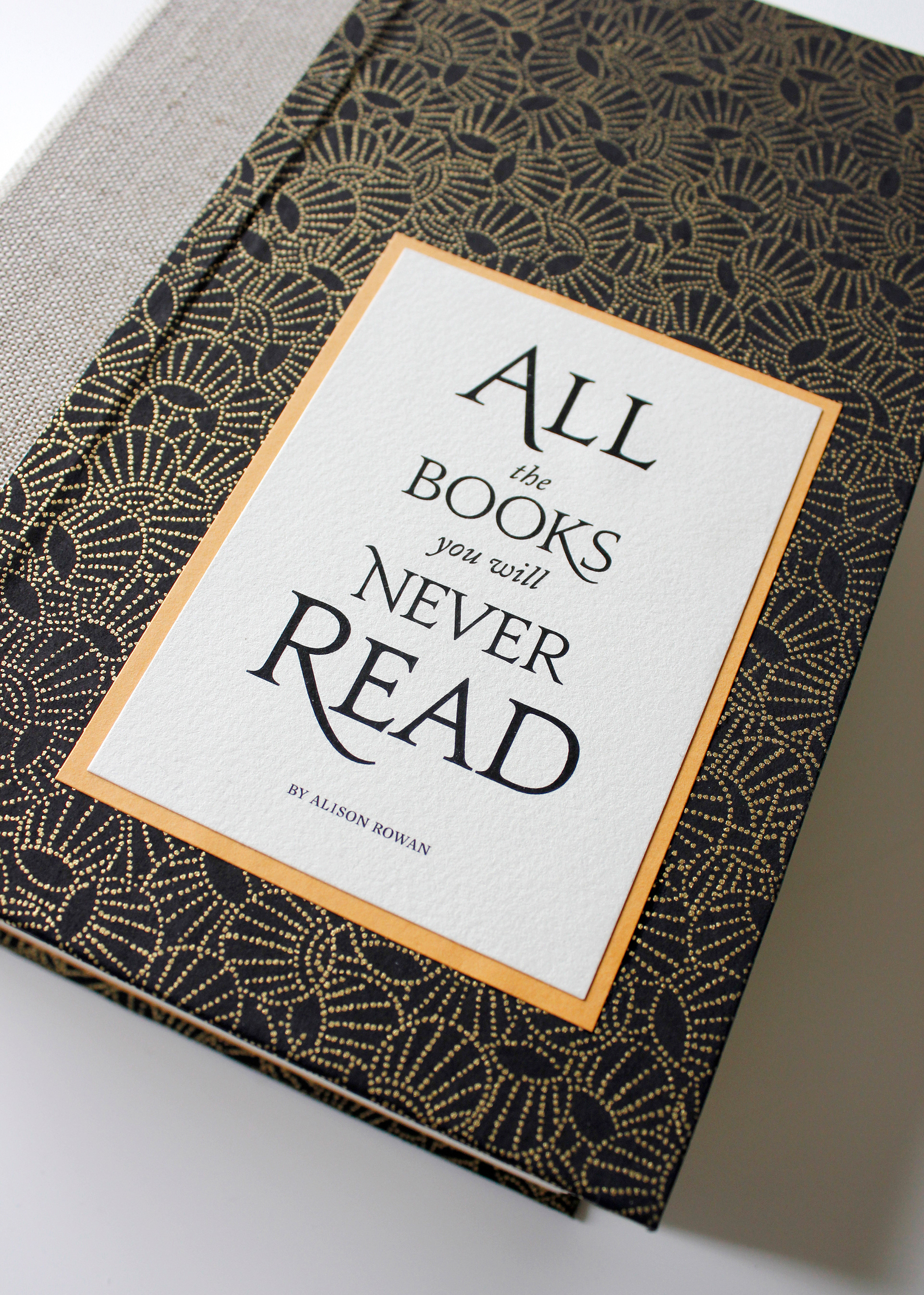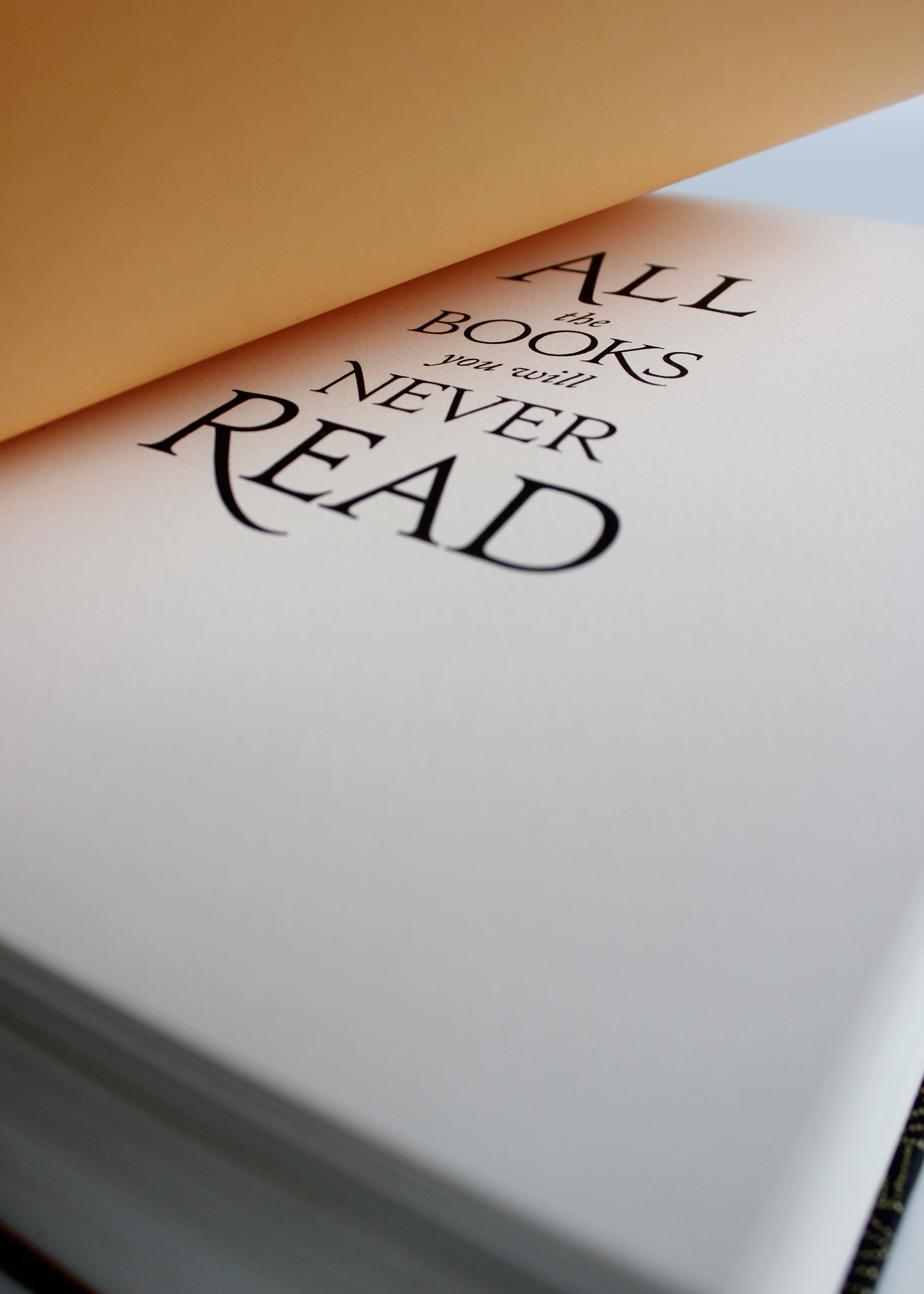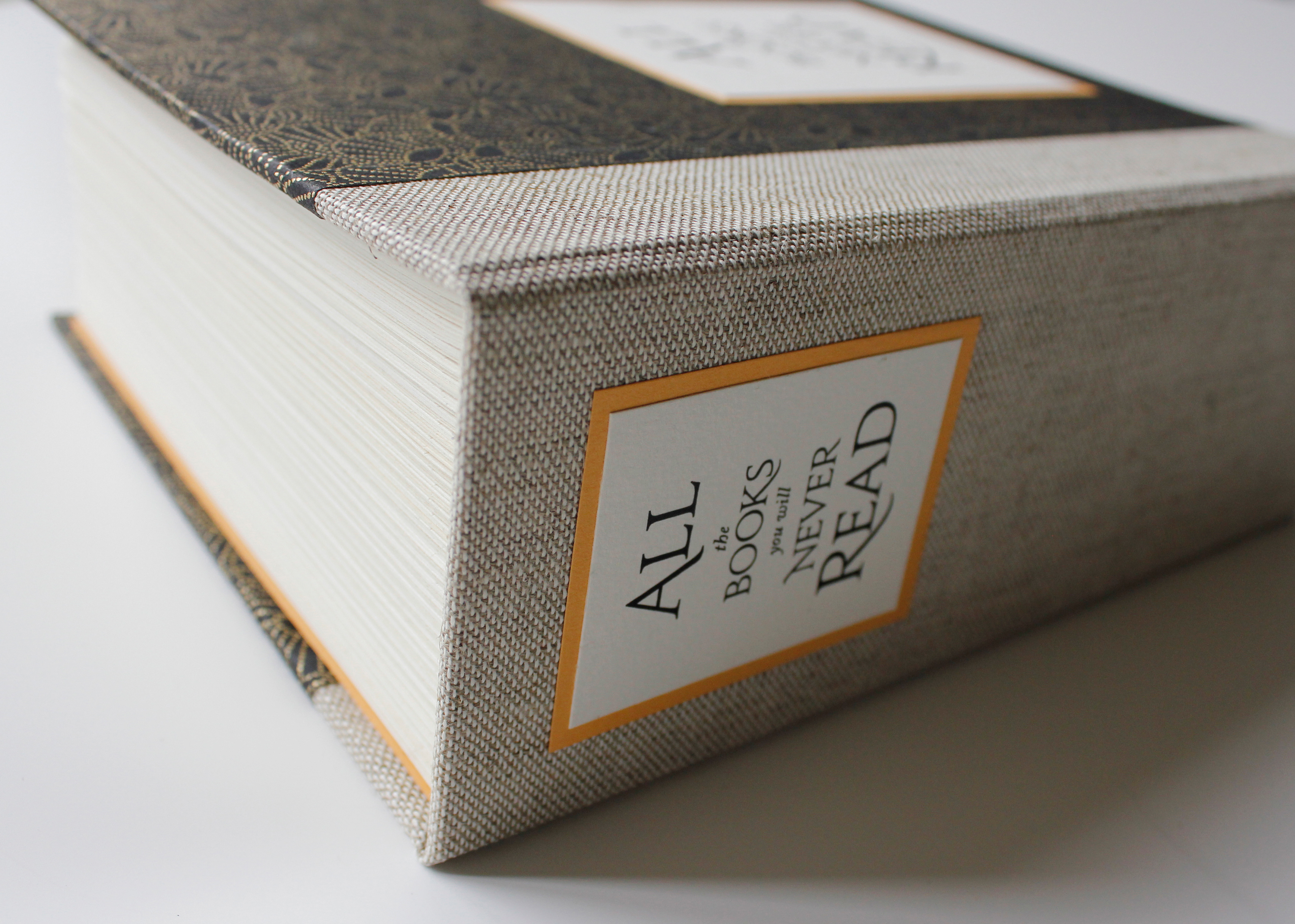All the Books You Will Never Read encapsulates the reader’s greatest fear: the impossibility of reading every book. Two hundred works, ranging from classics to contemporary, fiction to non-fiction, fill perforated pages. Each is to be torn out once its respective book is read, slowly silencing but never entirely defeating the fear for, as the foreword states, “…this may simply be considered Volume I.”