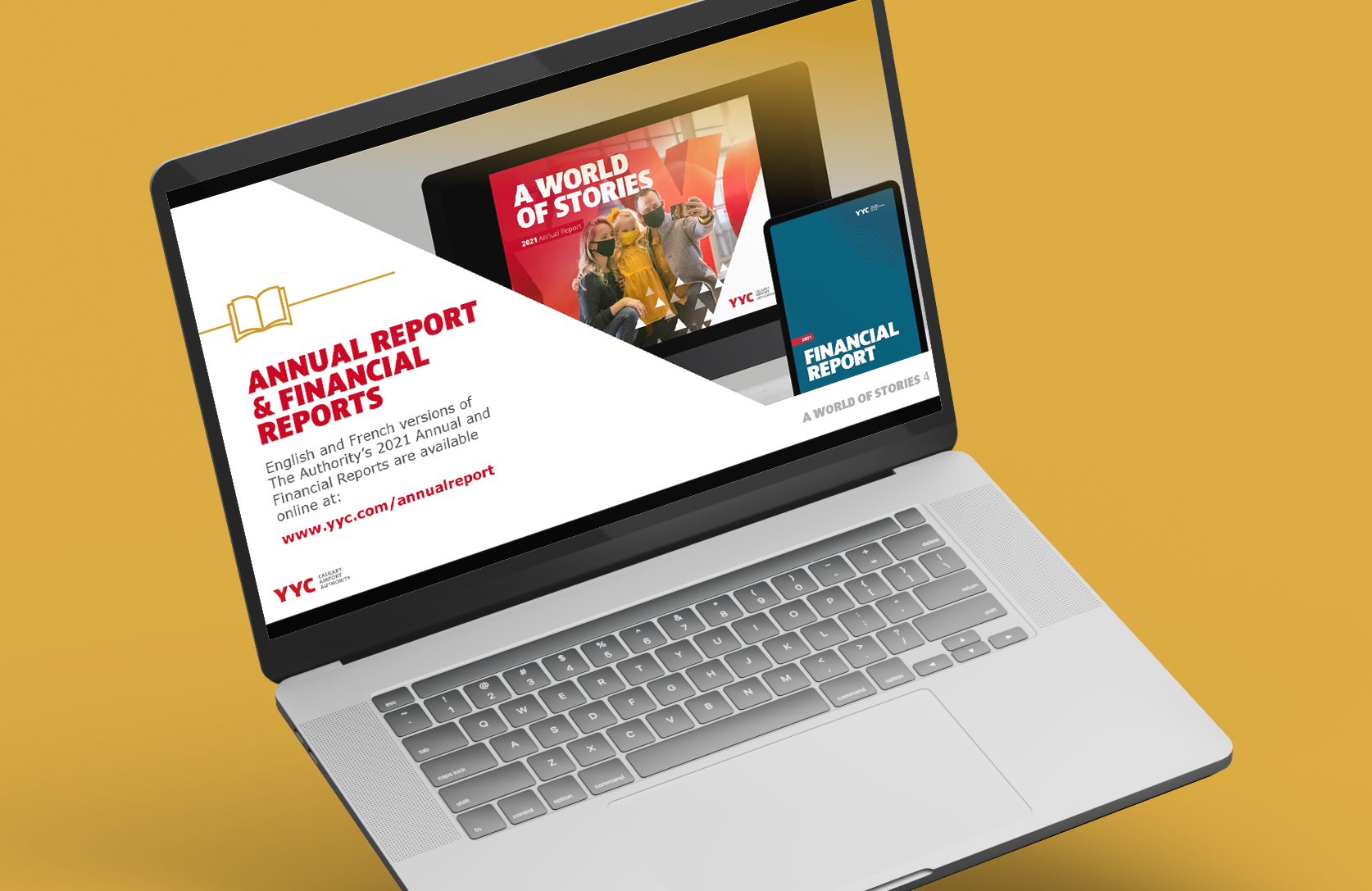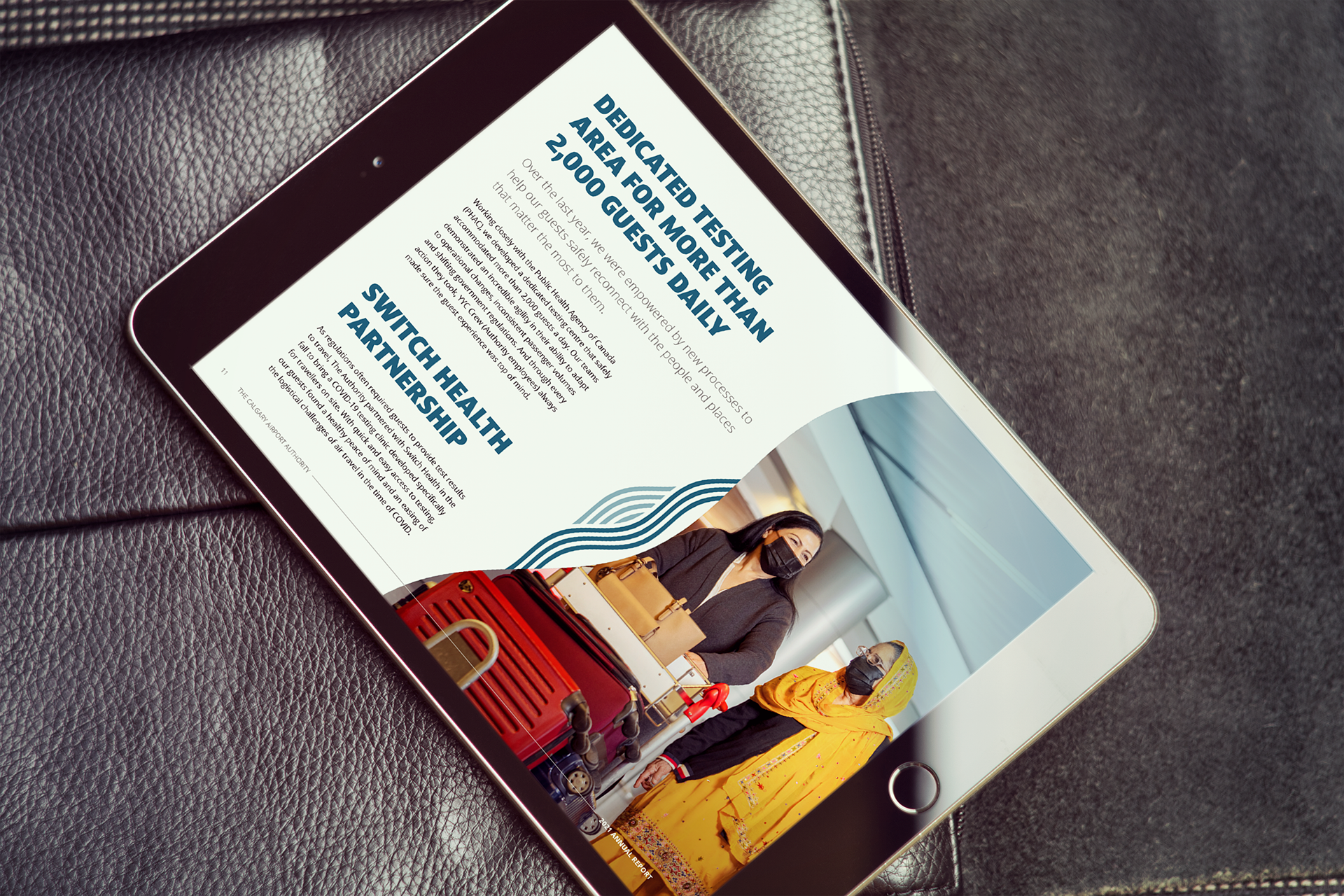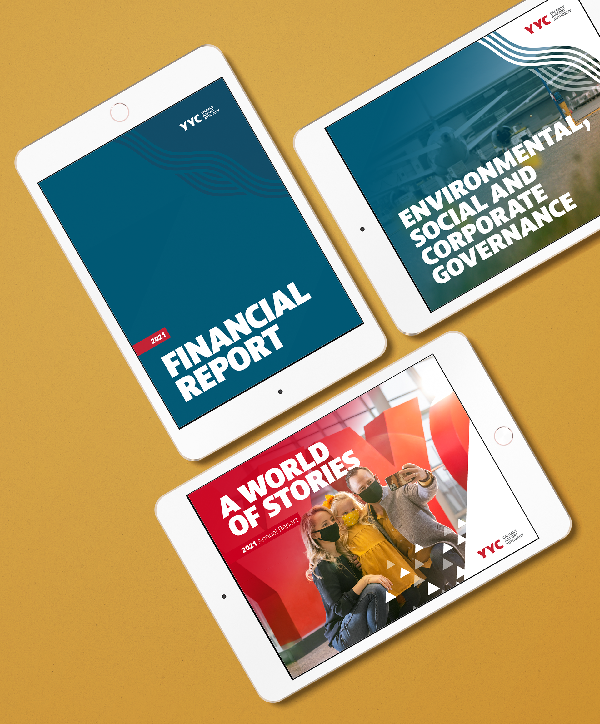 For the Calgary Airport Authority's annual series of reports for 2021, the objective was to create a suite of documents that would reflect the optimism and resilience of the CAA as pandemic flight impacts began to ease. This included an Annual Report, Financial Report, and Environmental, Social & Corporate Governance Report (all in both English & French versions), as well as a presentation deck for the Annual General Meeting.