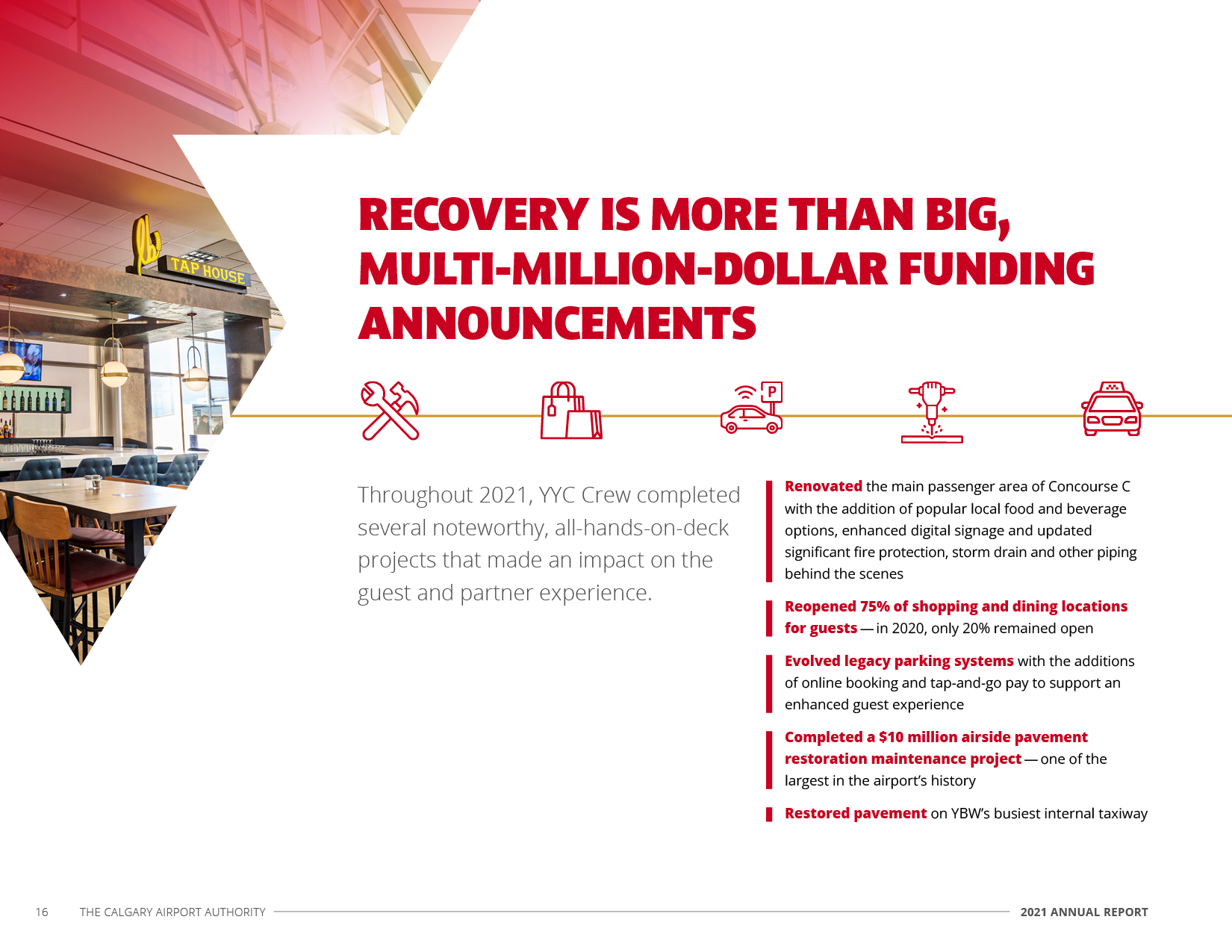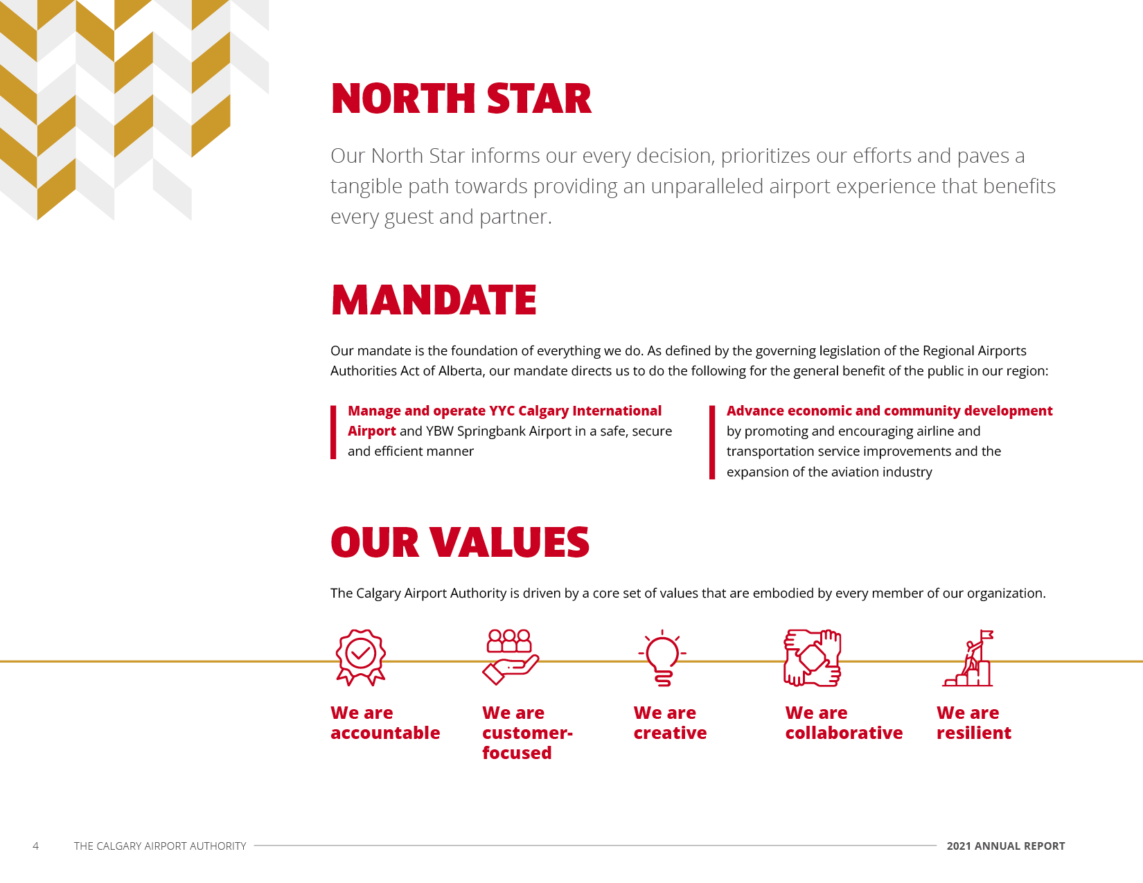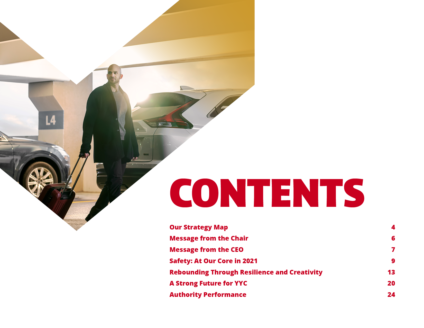 For the Calgary Airport Authority's annual series of reports for 2021, the objective was to create a suite of documents that would reflect the optimism and resilience of the CAA as pandemic flight impacts began to ease. This included an Annual Report, Financial Report, and Environmental, Social & Corporate Governance Report (all in both English & French versions), as well as a presentation deck for the Annual General Meeting.