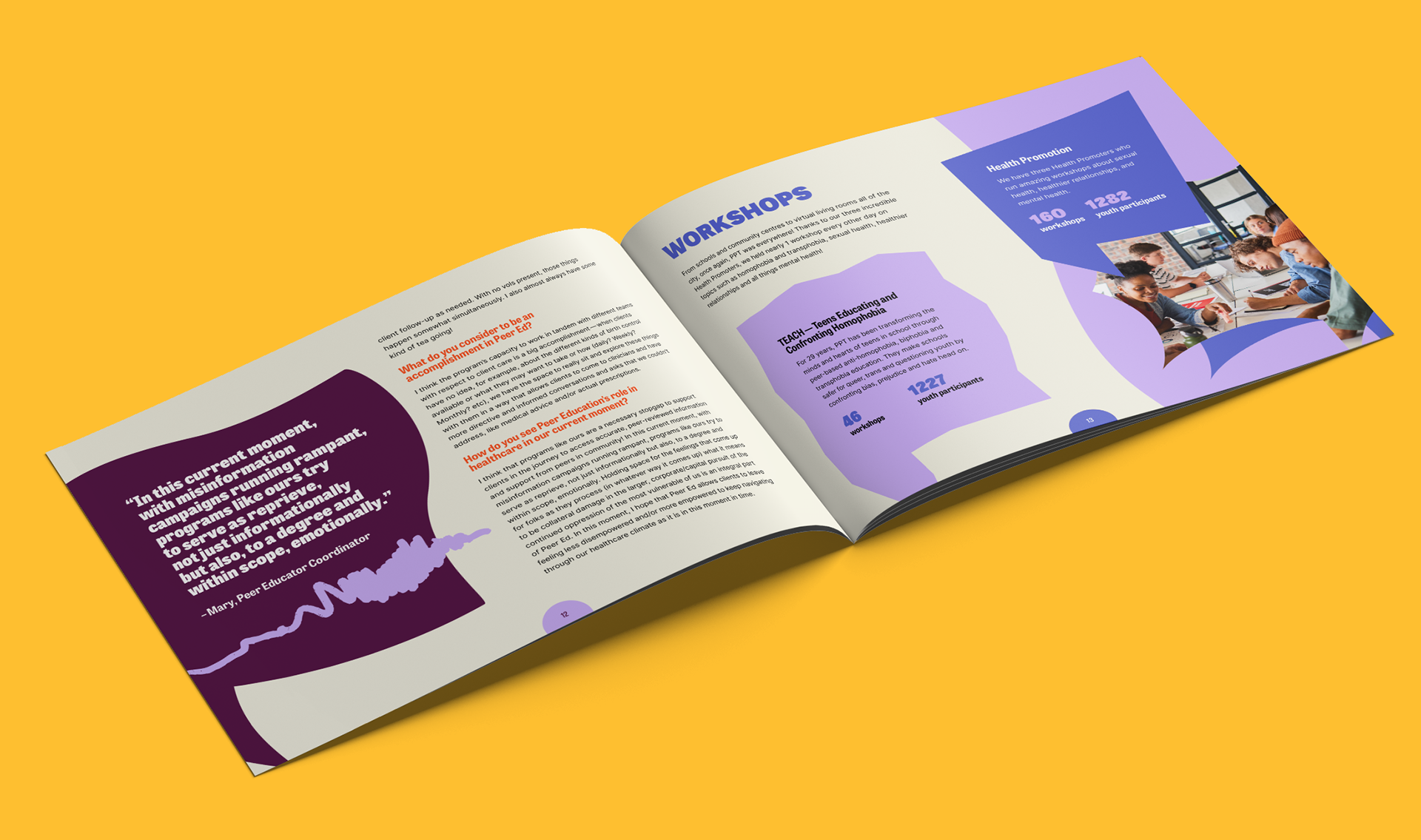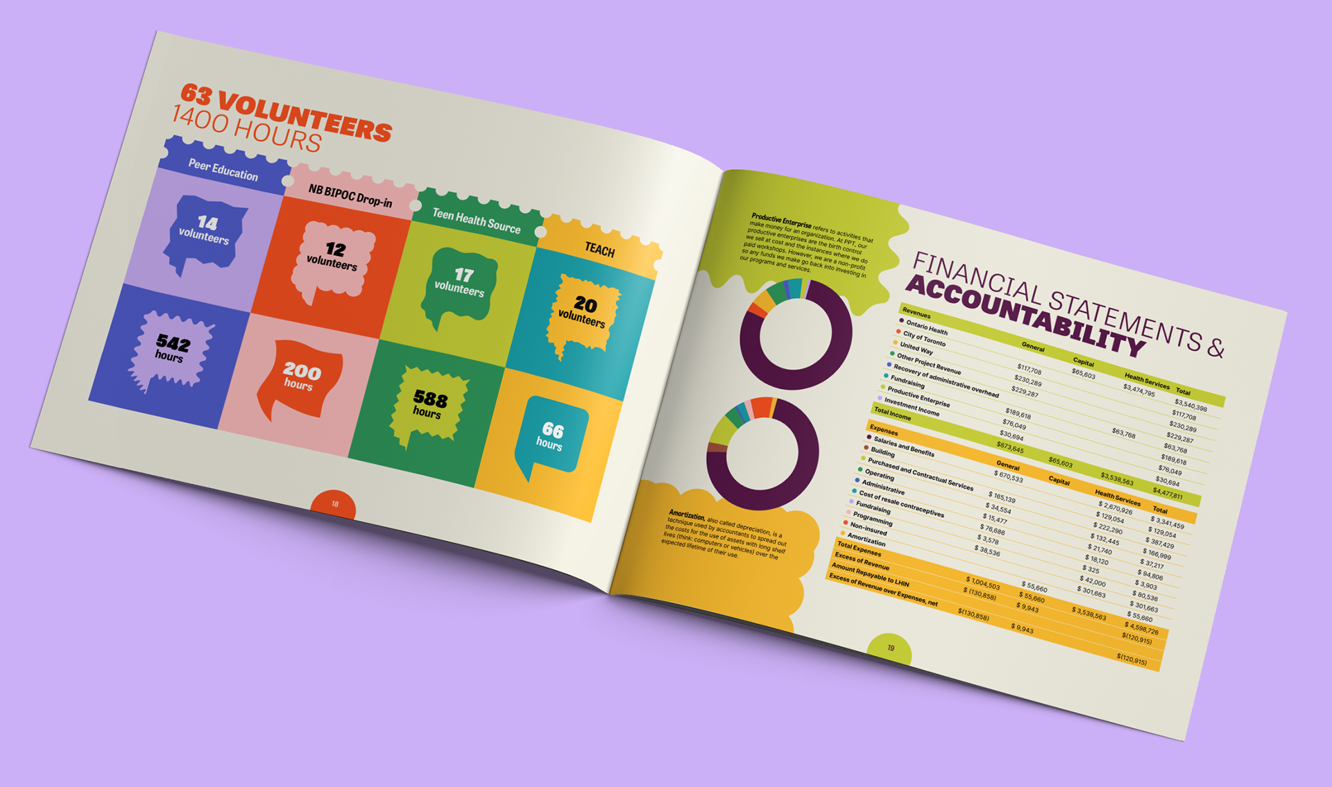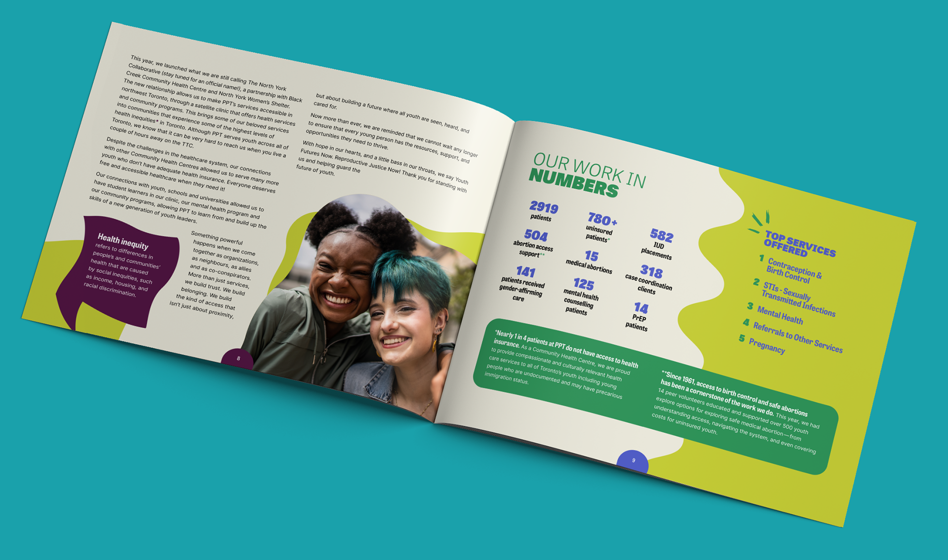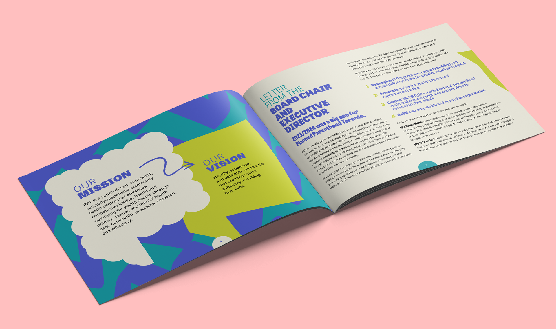 For Planned Parenthood Toronto's 2024 annual report, I used their existing brand style as a foundation to create bold, dynamic layouts conveying the required information in an approachable and engaging way for their diverse young audience. In the face of growing barriers to reproductive justice and gender equity, the project sought to capture a sense of optimism, hope, and community.
