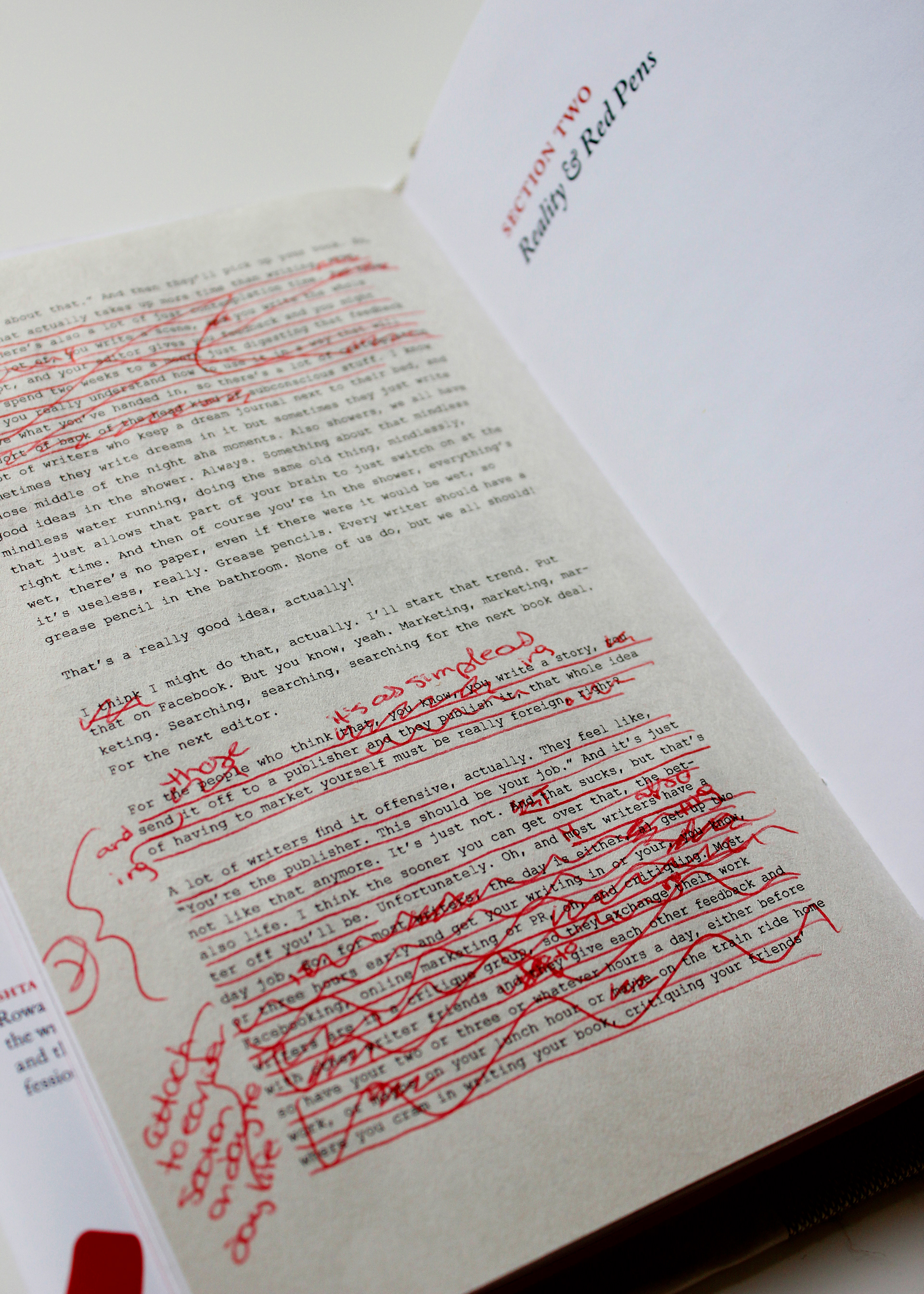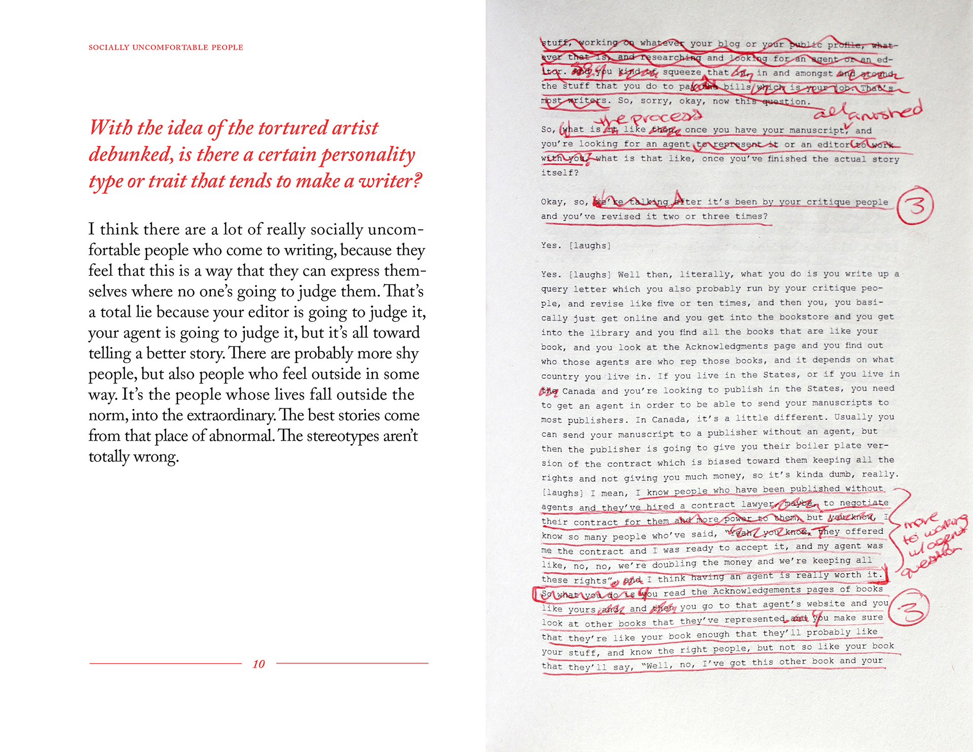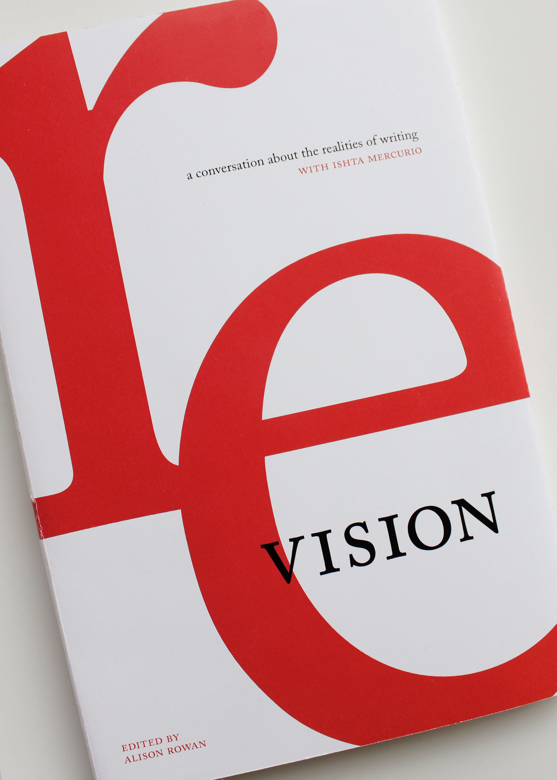 ReVision is a book designed to challenge common perceptions of writing as a profession, from the tortured soul to the notion that a completed manuscript equates to publication. Based around a recorded conversation shared with author Ishta Mercurio, ReVision presents the final text of the book side-by-side with the original conversation transcript, covered in red markings indicating all the changes that occurred from start to finish in order to reveal the often-hidden challenges and complexities of writing.