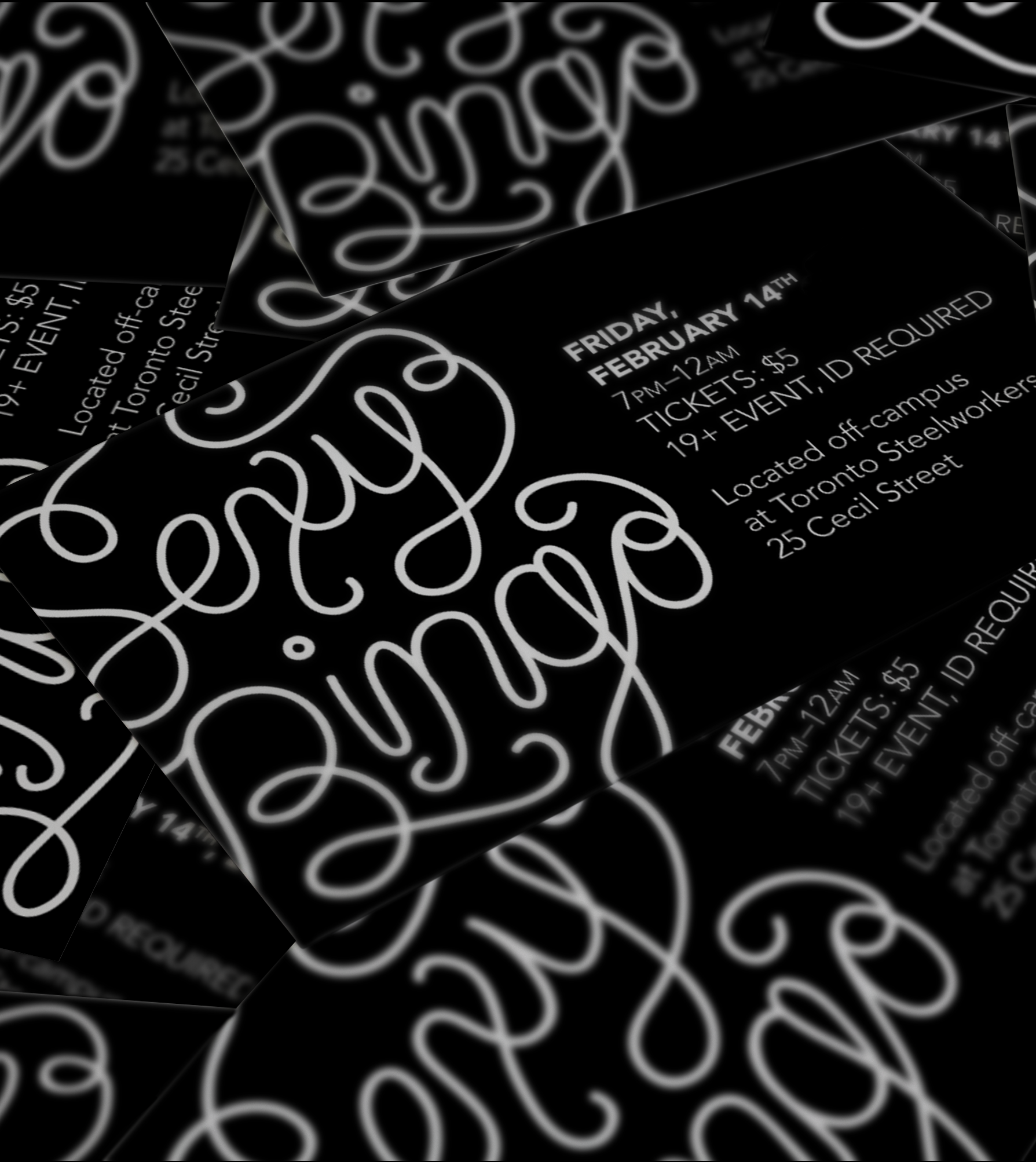 The OCAD Student Union wanted a playful lettering-based poster and matching tickets for their Sexy Bingo event. The design needed to be in black and white to leverage the school's low-cost large format black and white printer to produce the posters inexpensively. In my favourite client follow-up to date, I'm told the design was so popular as to be problematic, with posters repeatedly being stolen from the walls of the school.