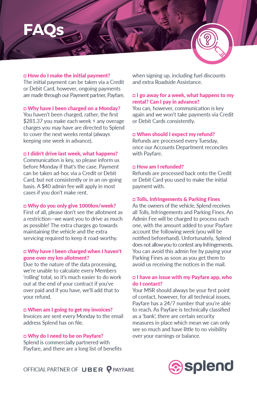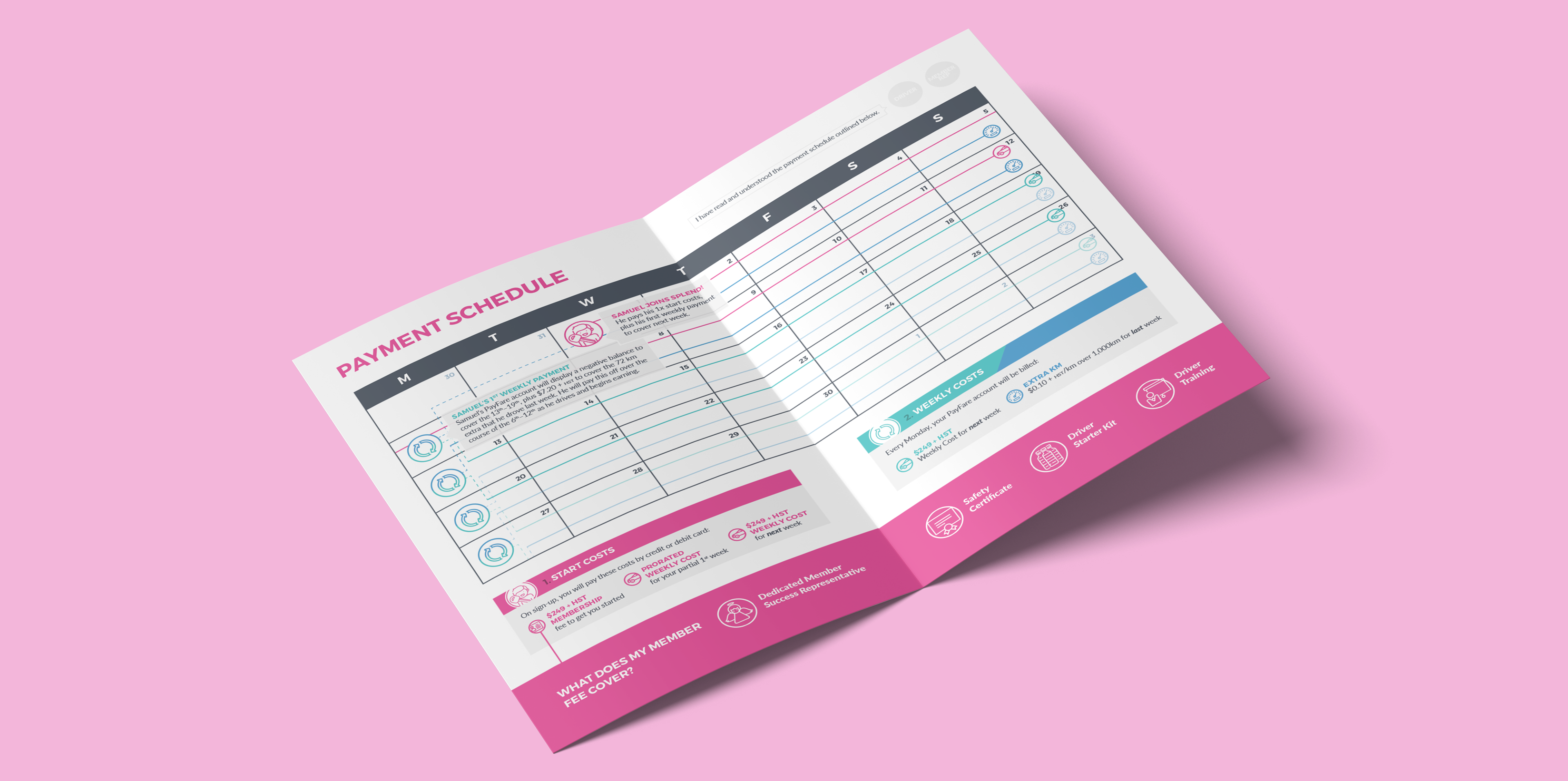 Splend is a service that provides vehicles for drivers of on-demand platforms like Uber. They recently expanded to Canada, and while they had some basic elements in place, the brand needed to be fleshed out with additional colours and a graphic style. I then applied this style to the design of diagrams and flowcharts to act as visual aids for Splend's representatives tasked with articulating complex processes to the service's new users.