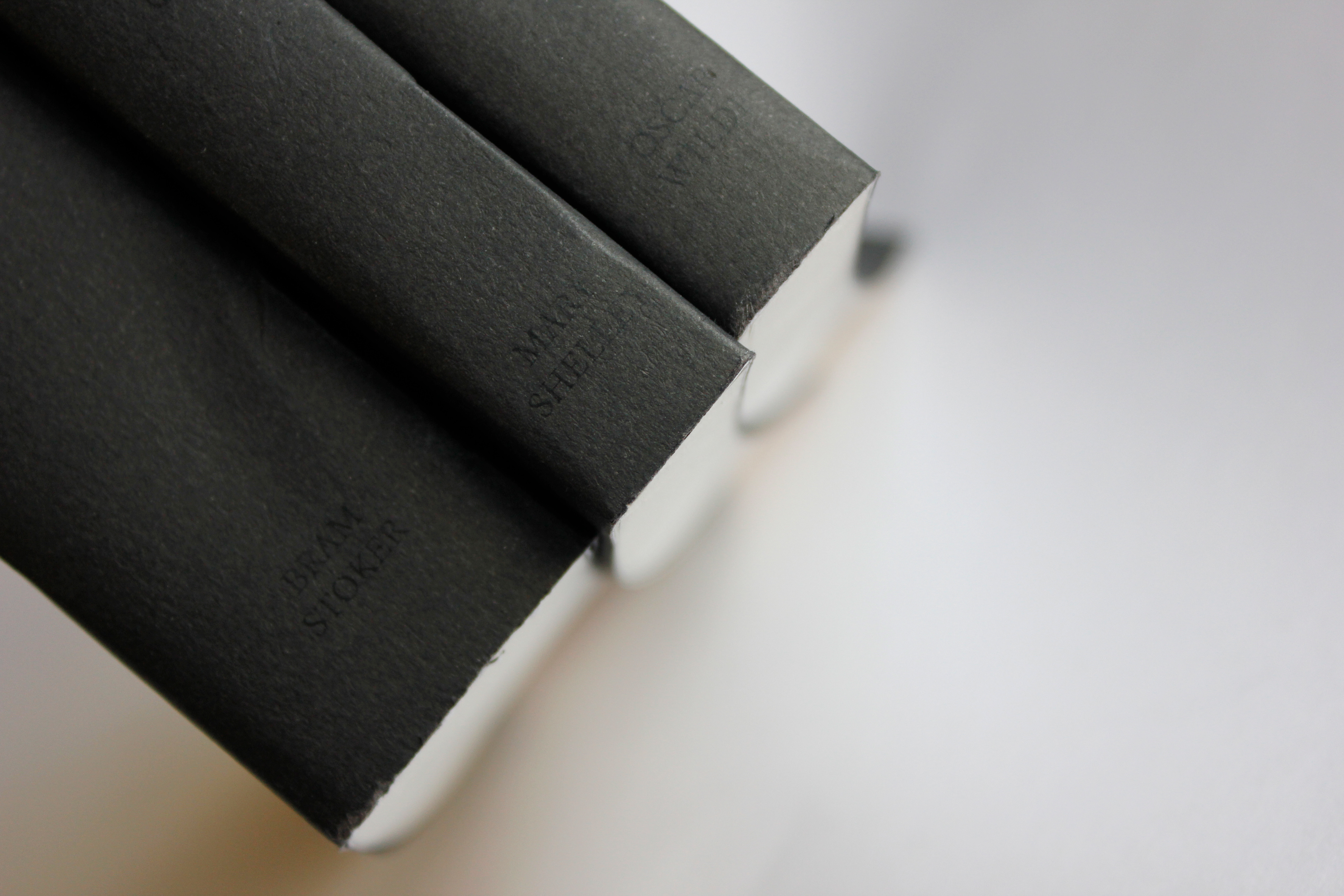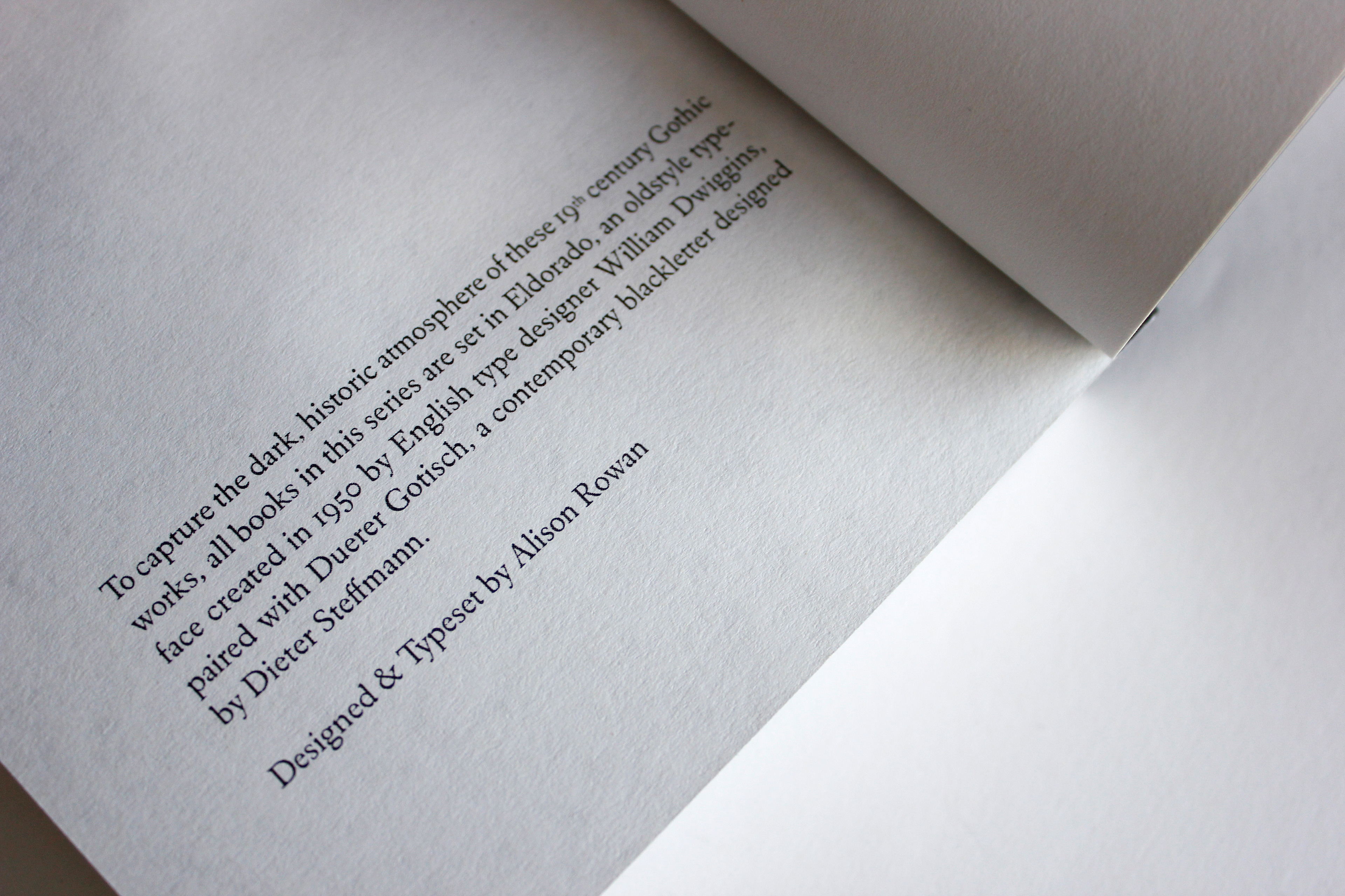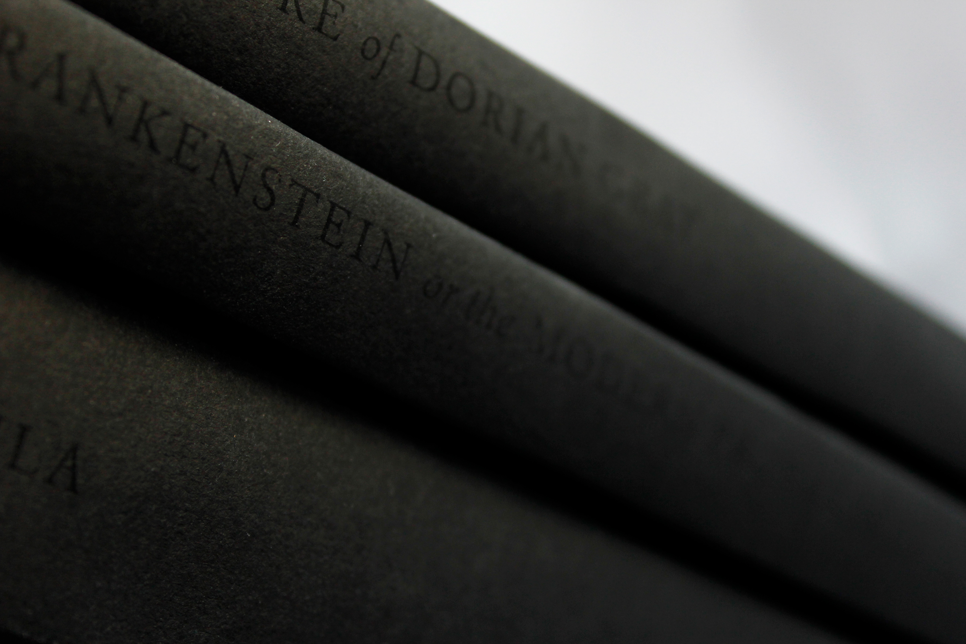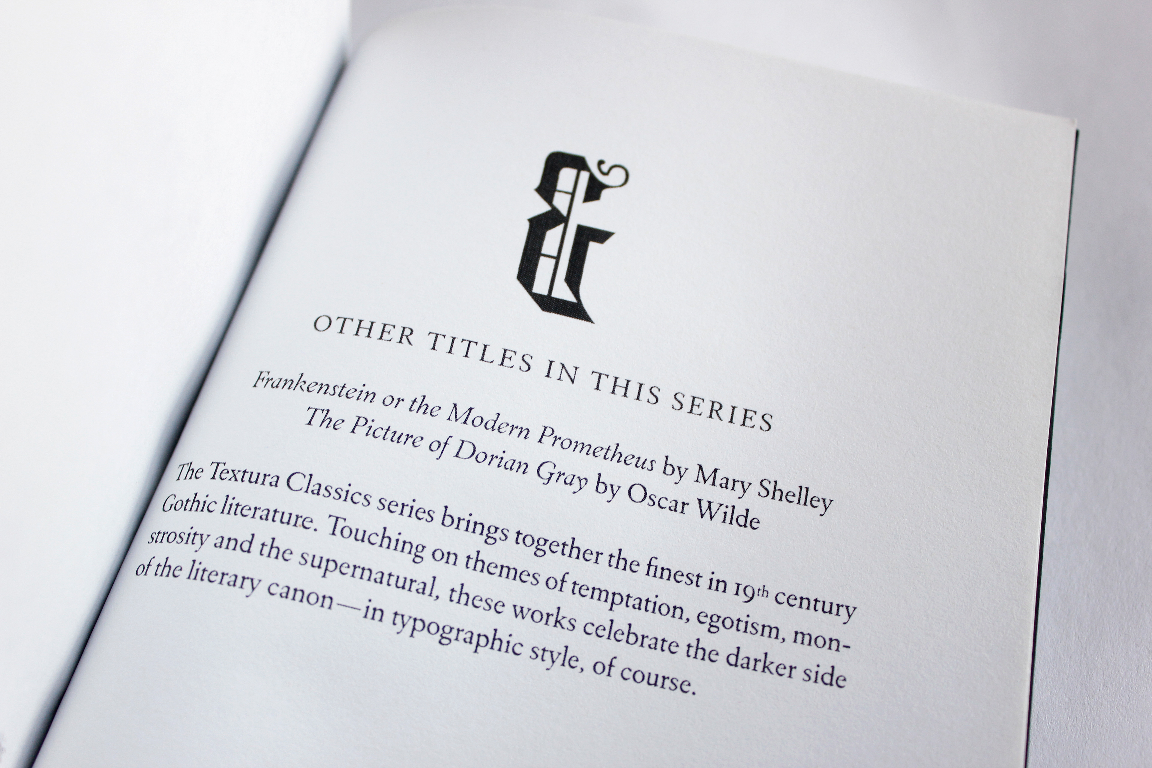 The Textura Classics are a series of 19th century gothic novels designed to take a fresh, sophisticated approach to the graphic treatment of these works. Using a textura typeface and immense swaths of black both inside and out, the books evoke the dark, unsettling and claustrophic atmospheres of the stories they house.