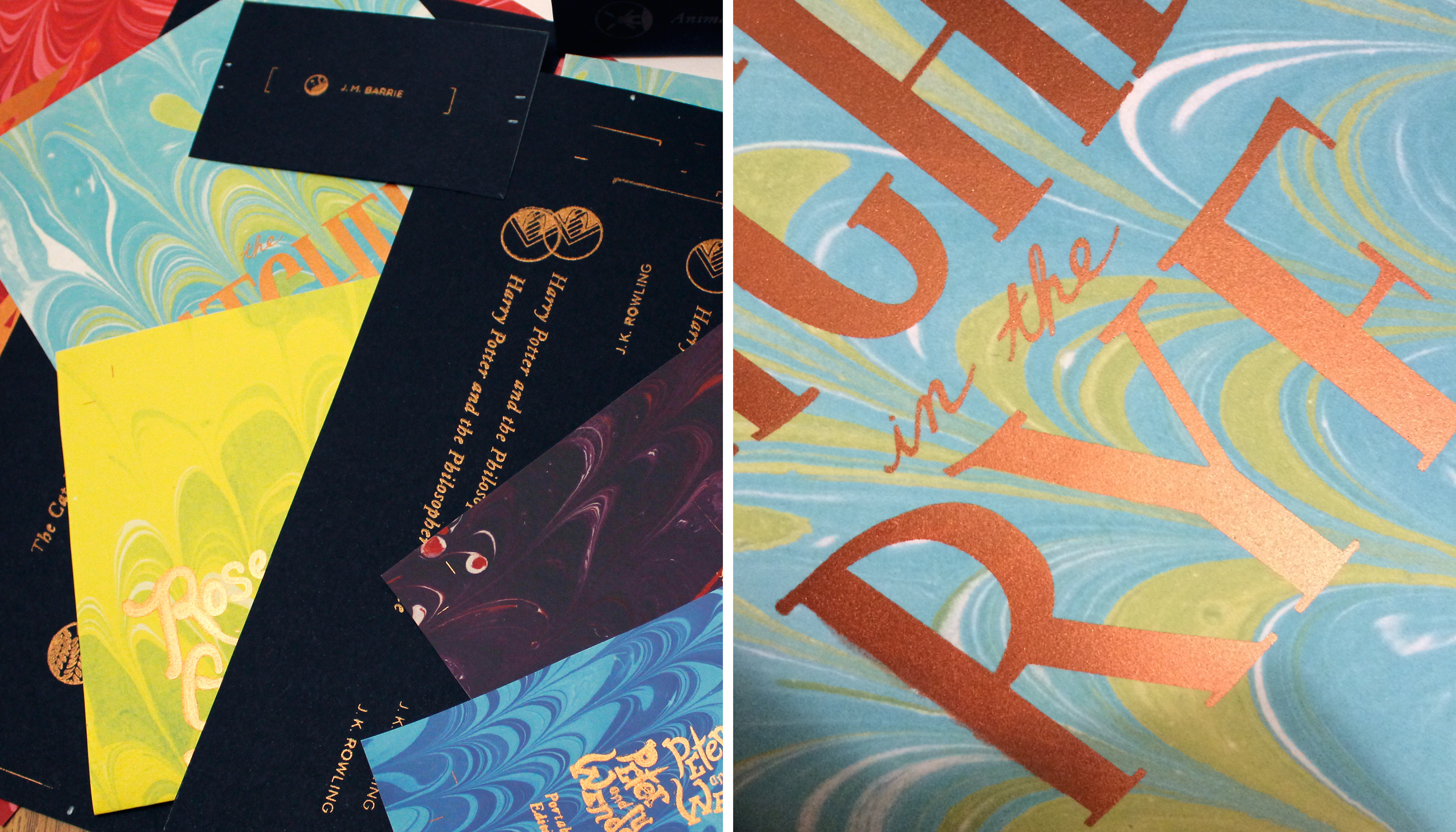 The patterns forming the backgrounds for the book covers were created using the centuries-old technique of paper marbling.