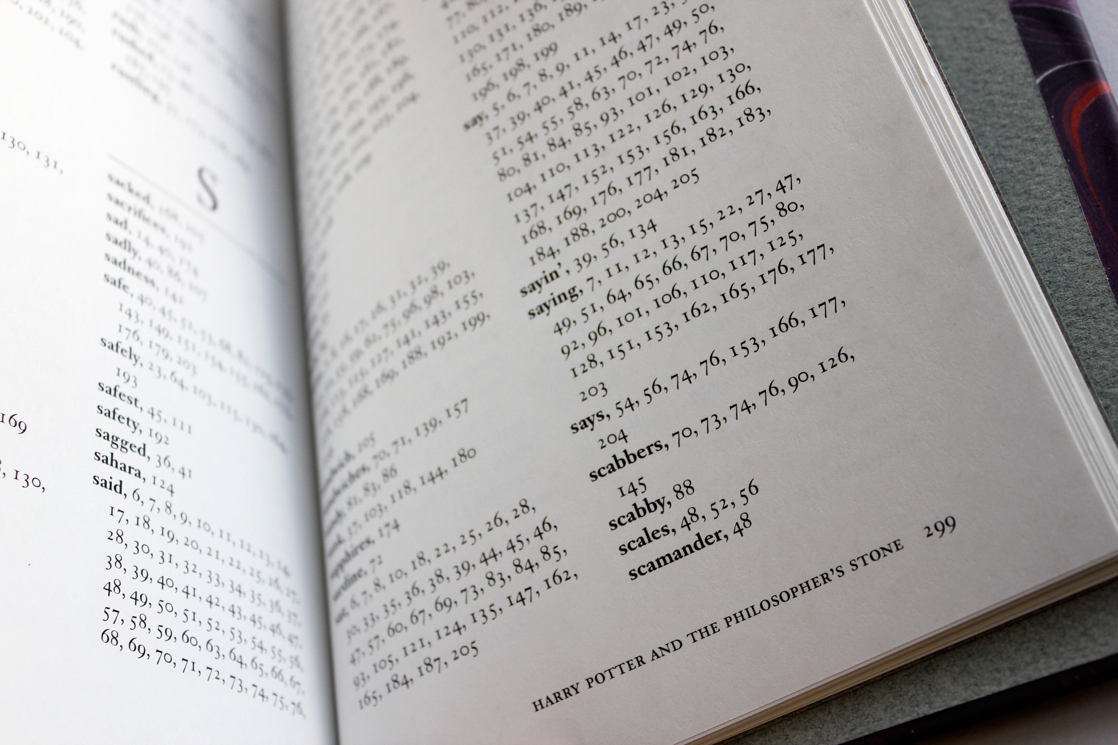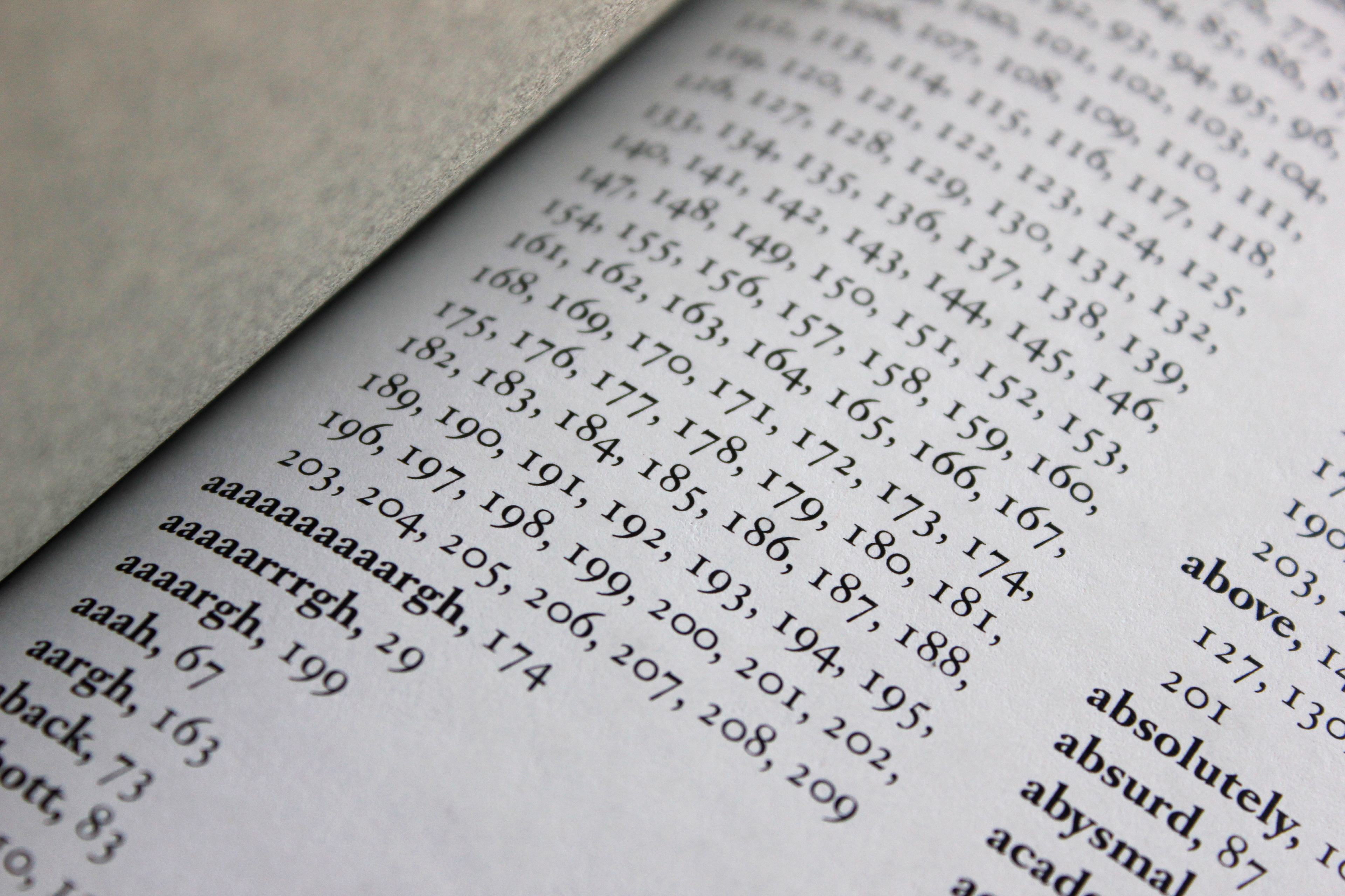 The searchable book's index, over 125 pages long and containing every single word in the text, makes up more than a third of the book's pages.