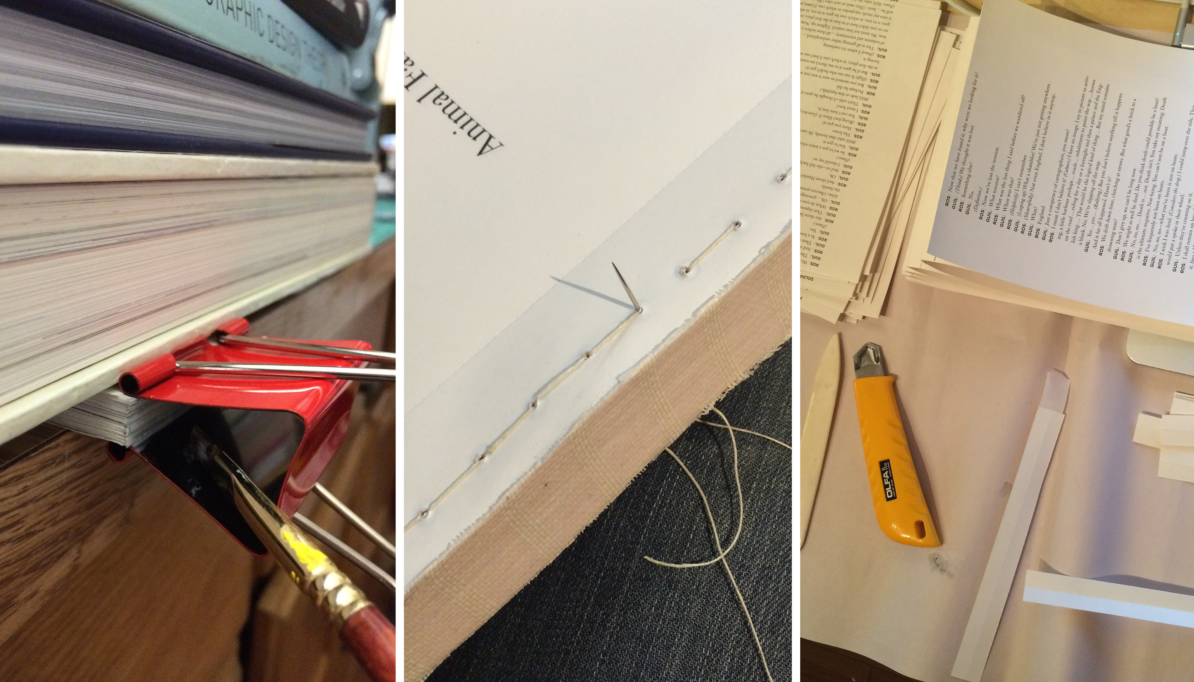 The five books required four different binding techniques, which were all done by hand. From left: perfect binding the portable book, combination perfect binding and stab stitching the shareable book, and accordion binding the infinite scrolling book.