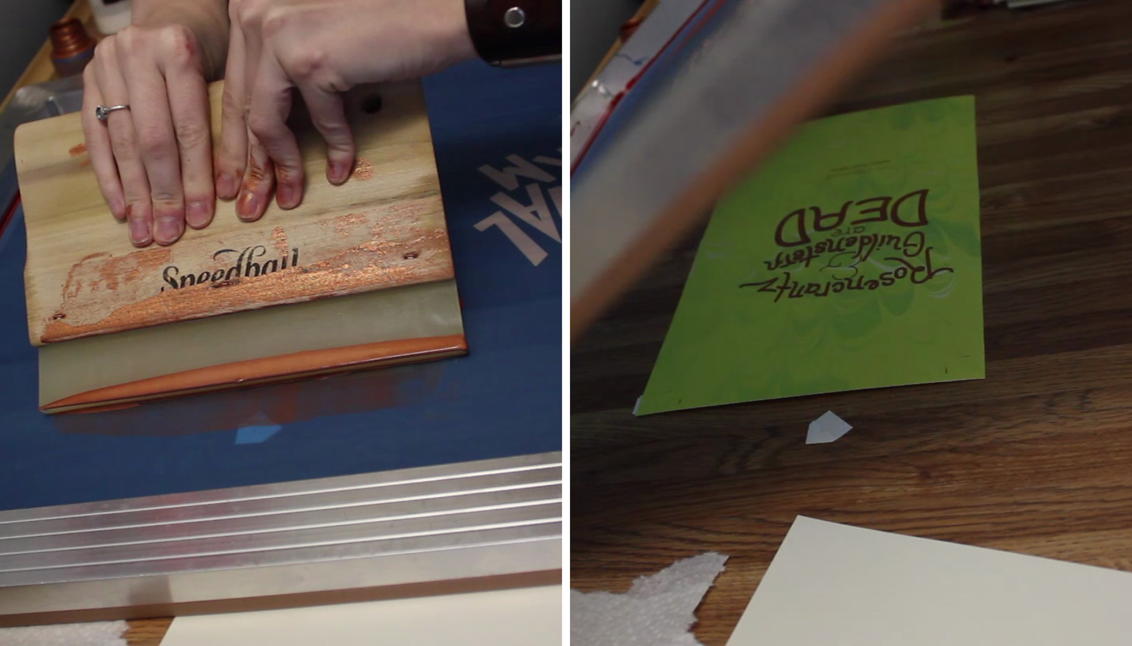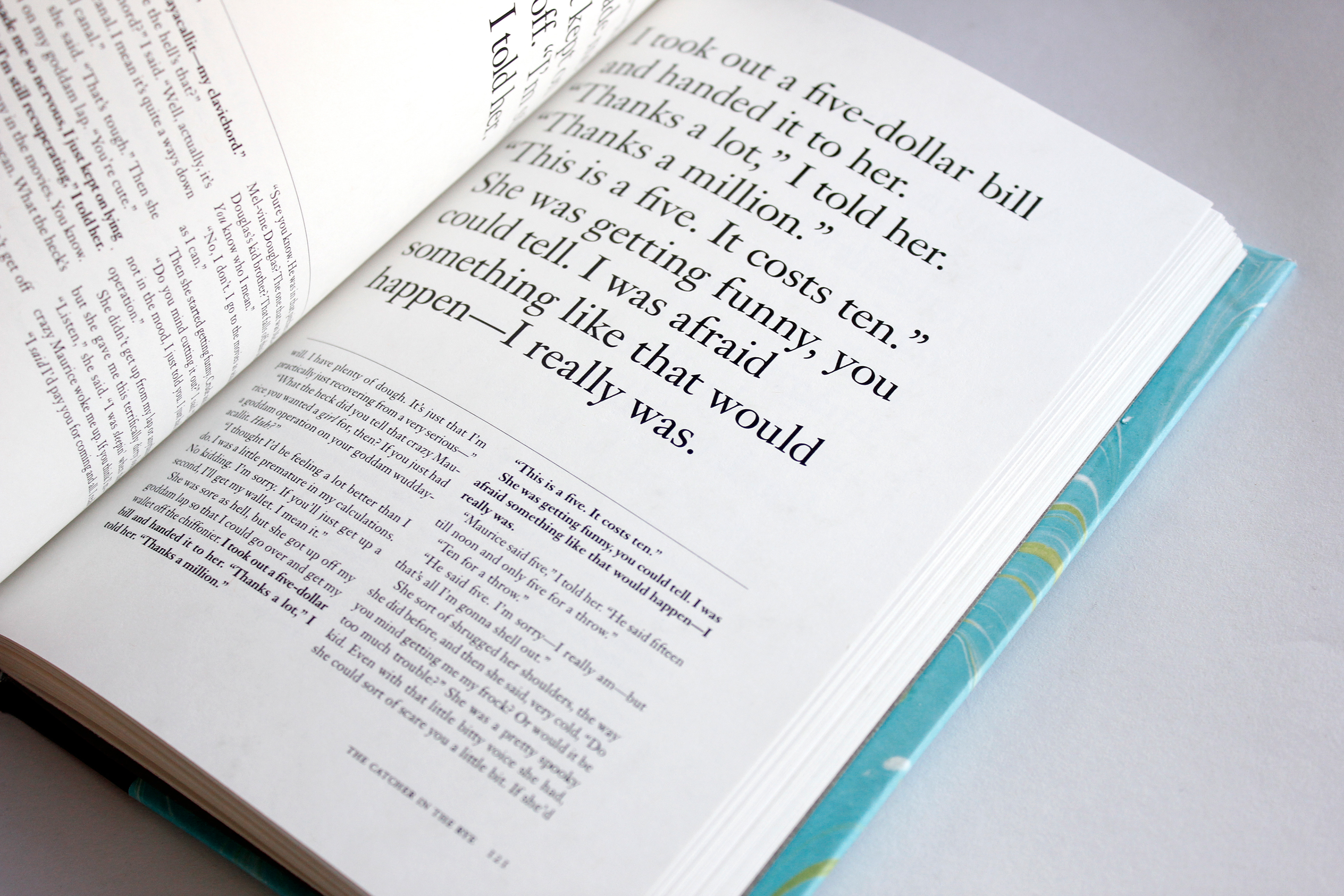 To finish the covers and spines, the typography and lettering were screen printed to achieve a luxurious, metallic effect. As only my second time screen printing, and my first printing type, the process involved some serious trial and error (left).