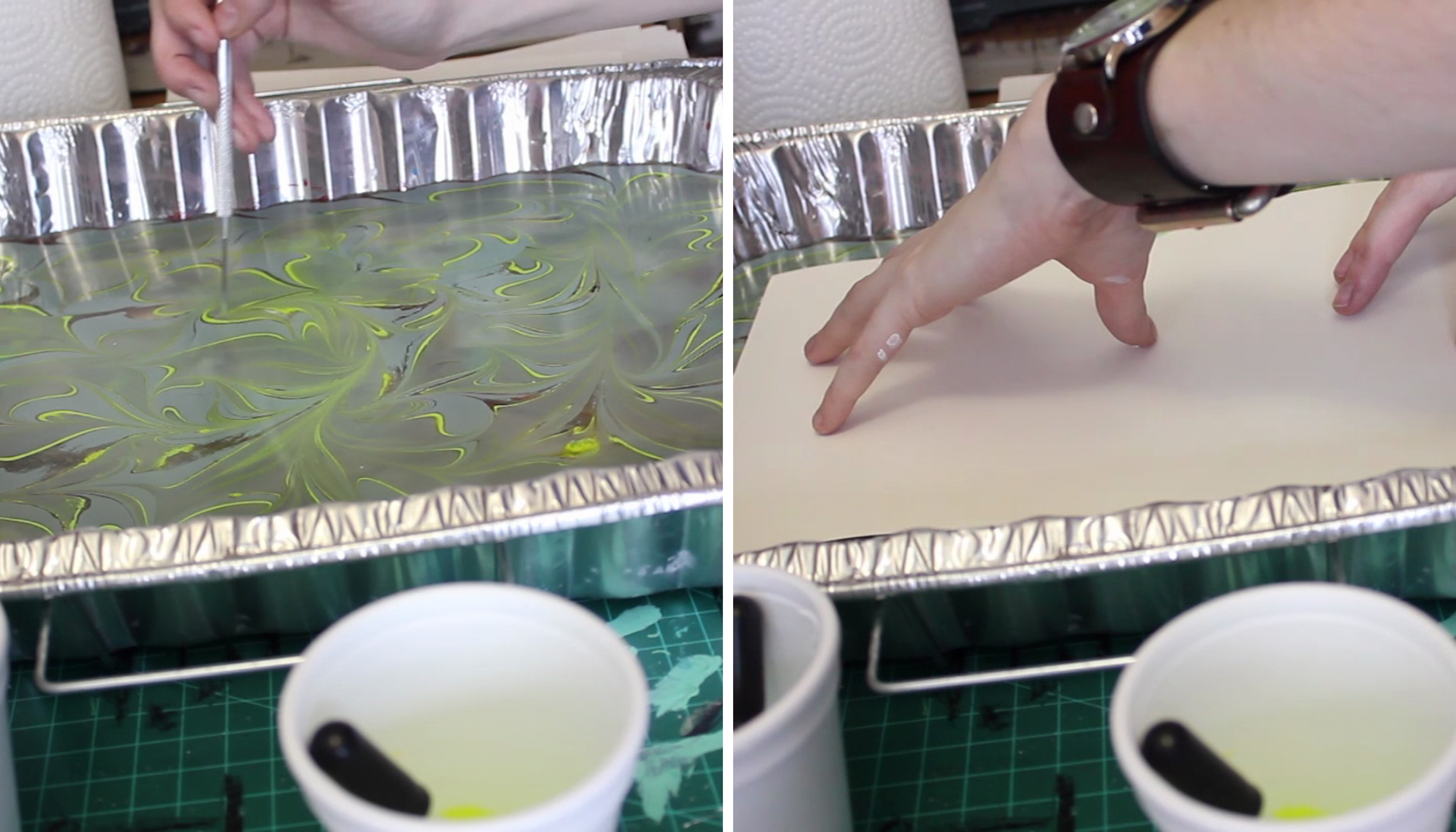 The inks are then manipulated using a combination of stylus and rake or comb instruments to create designs before the paper is placed on top to transfer the pattern to its surface.