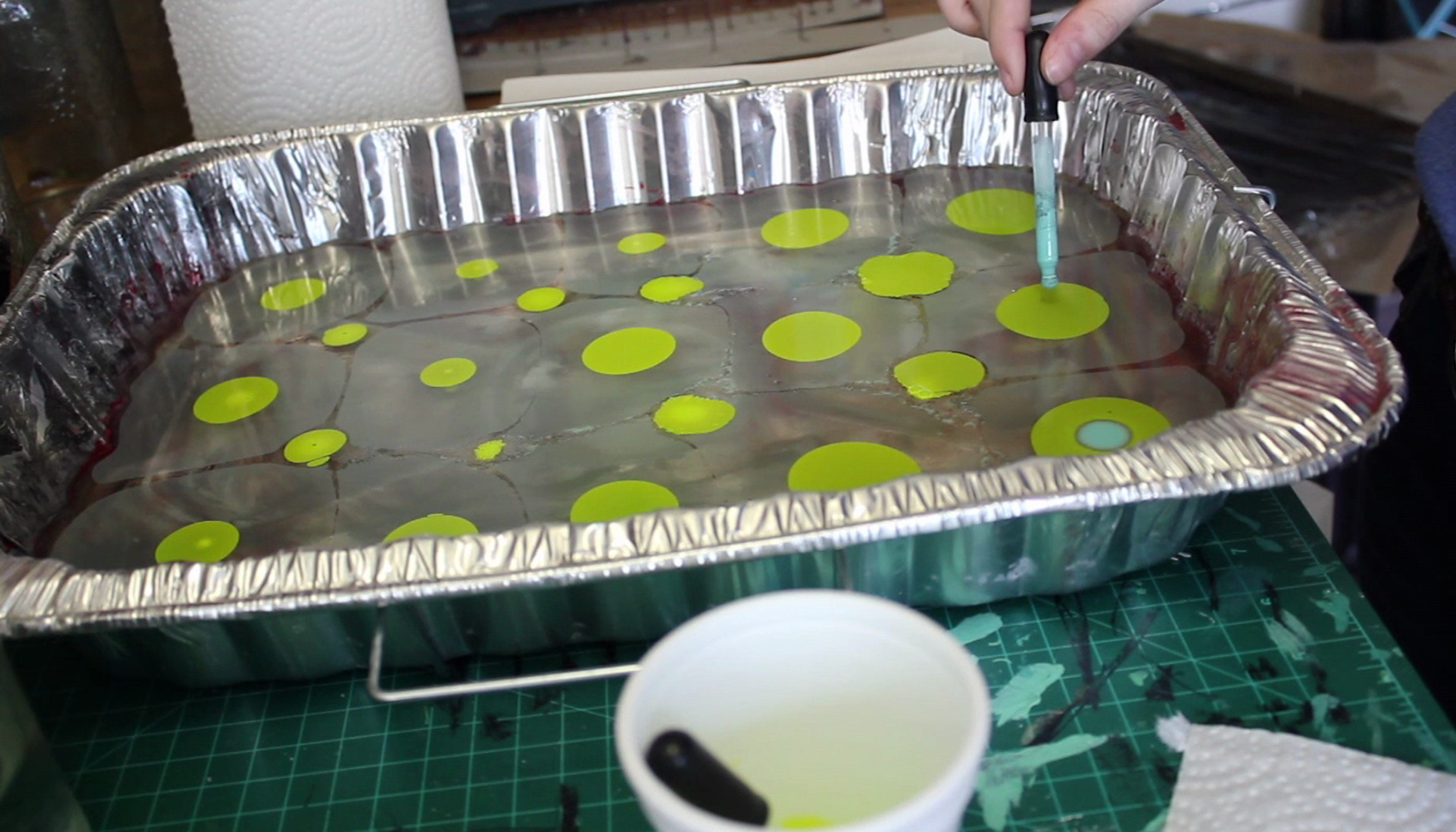 Colours are floated on the surface of a liquid base, and layered on top of one another.