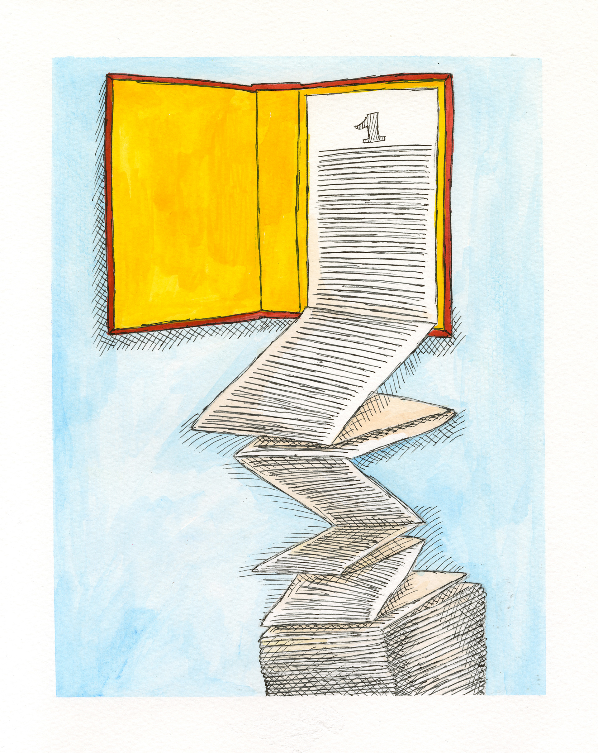 The entire book is bound accordion-style using paper hinges to create a continuous (if unwieldy) reading experience devoid of page turns.