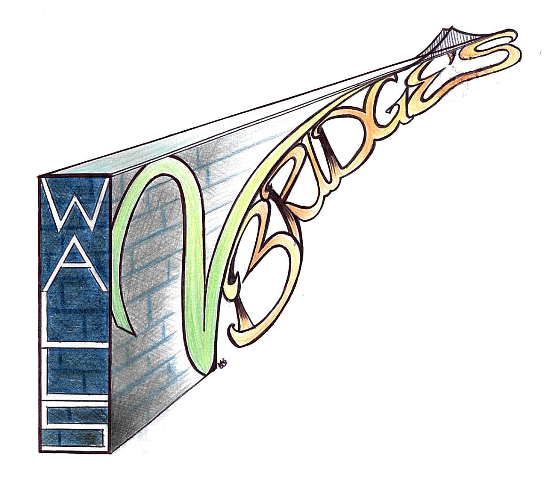 The drawing that inspired the new brand design, created by one of the program's past participants. It embodies the premise of Walls to Bridges, illustrating the barriers faced by criminalized/incarcerated students that are transformed into bridges to new opportunities through the innovative educational strategies of the program.