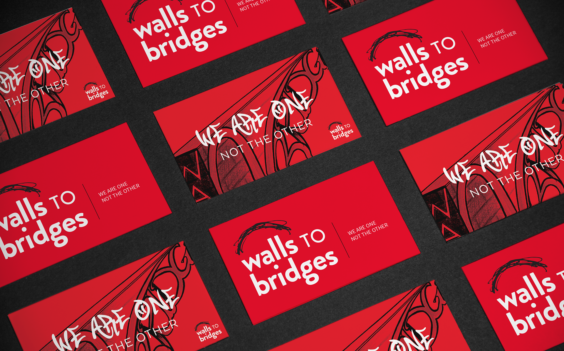 To address the two very different audiences for the Walls to Bridges program, two separate designs were created for the front of the business card: one clean and simple, catering to a more institutional audience, and one more dynamic for prospective participants of the program, placing a greater emphasis on the slogan as an expression of the organization's purpose. The second design leverages a drawing created by one of the program's past participants.
