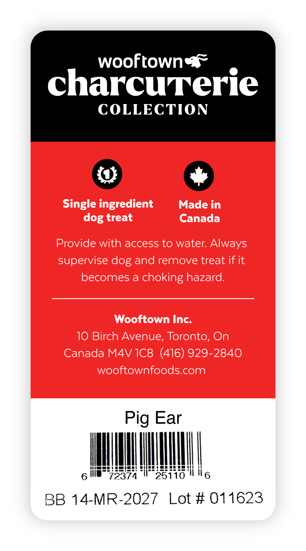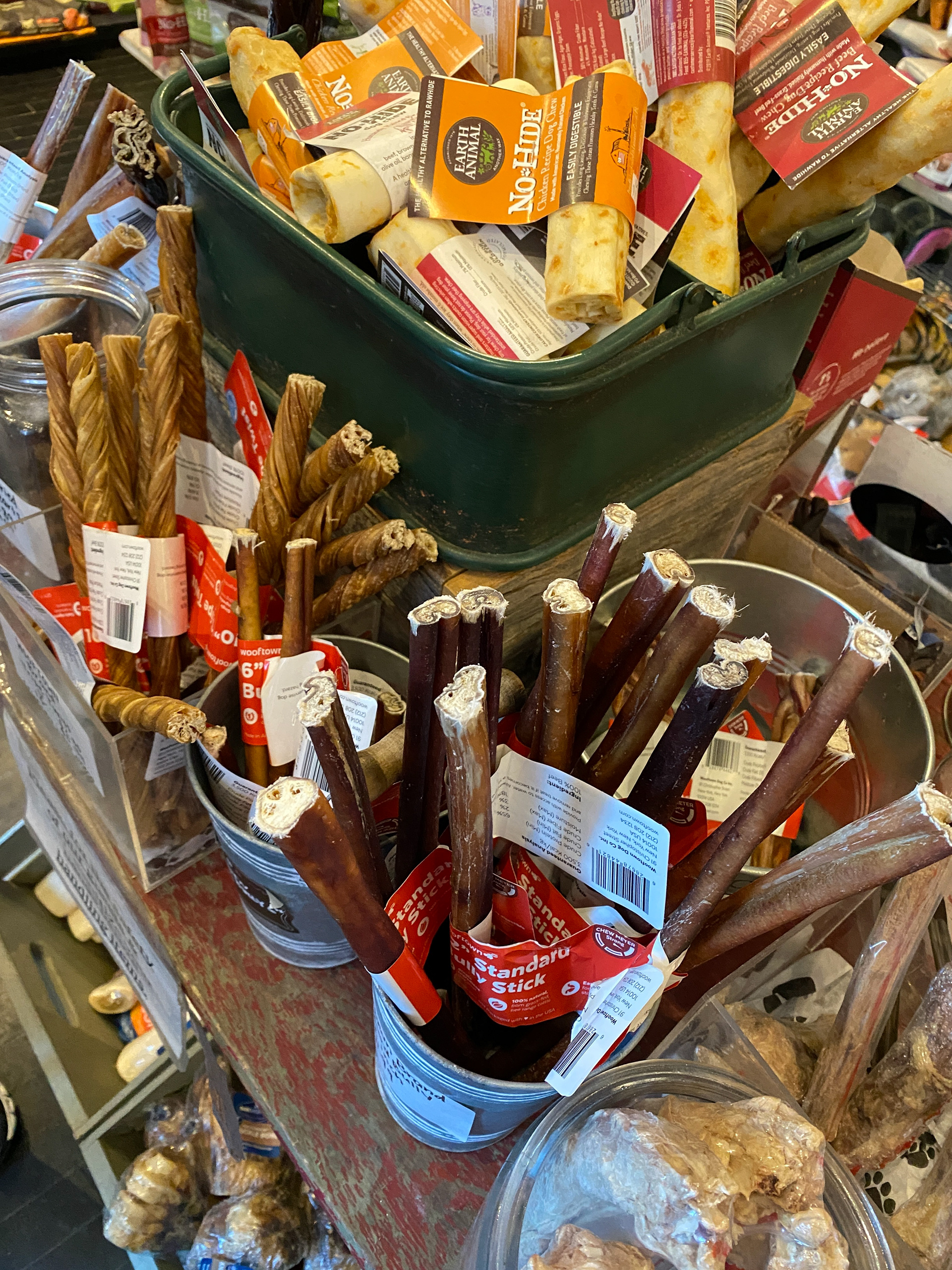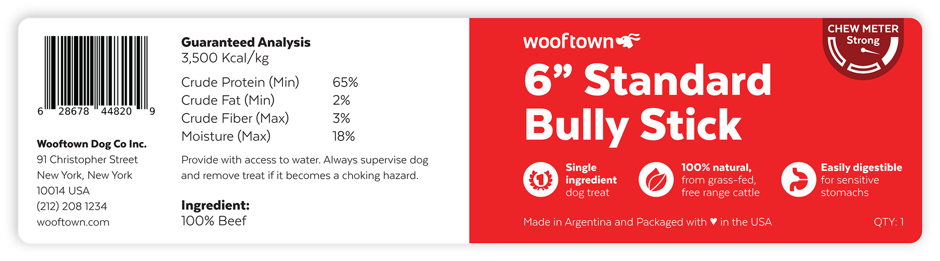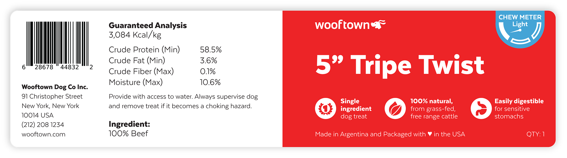 Independent pet supply business Wooftown needed labels for their new lines of store-brand dog chews. For their main collection, I developed a design system for adhesive flag tags that would function for the extensive variety of product names in the category, and includes a "chew meter" to help customers distinguish between their choices.